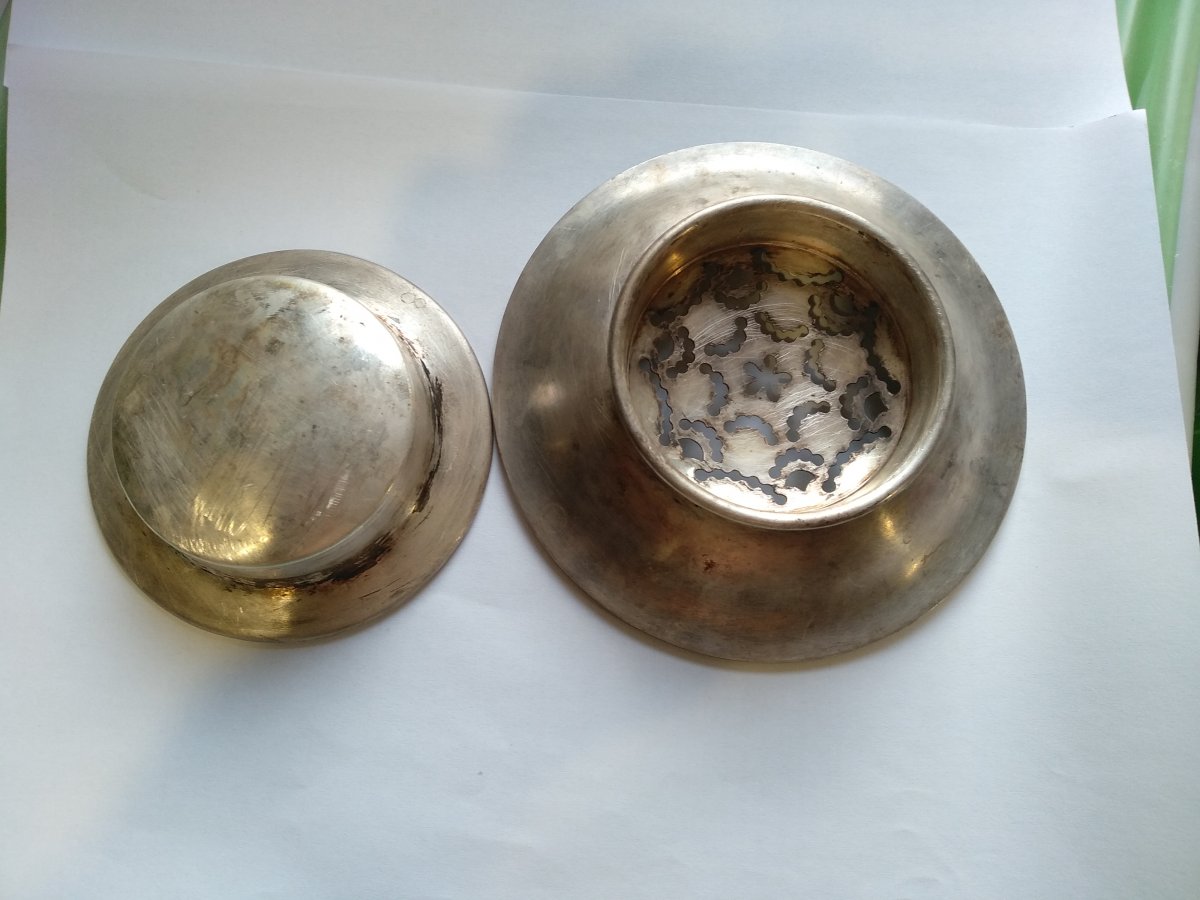Подскажите назначение данного предмета кухонной утвари,возраст, и сколько может стоить?Ювелир сказал что есть посеребрение. IMG_20190719_194336.jpg IMG_20190719_194449.jpg IMG_20190719_194503.jpg IMG_20190719_194518.jpg IMG_20190719_194529.jpg IMG_20190719_194539.jpg