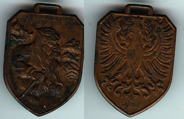 Толи знак то ли эмблема не могу определить самостоятельно .по сопутке 1 пфенинг.Ну и надписи есть но плохо читаемы.Со стороны орла TIROL а на обороте остатки слов MEINEI BERGEN BIN ICH сверху. А снизу DEIN SCHUTZ.примерно понимаю что стрелок,но хотелось бы узнать по лучше что за предмет.С ув.Извиняюсь за фото других нет.