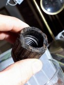 Гайка - бакелитовая... от времени она растрескалась и в неё "проросла" ржавчина от резьбы на оси, они срослись.... металлическая обойма - для защиты бакелита в месте соприкосновения с металлом в зафиксированном положении.