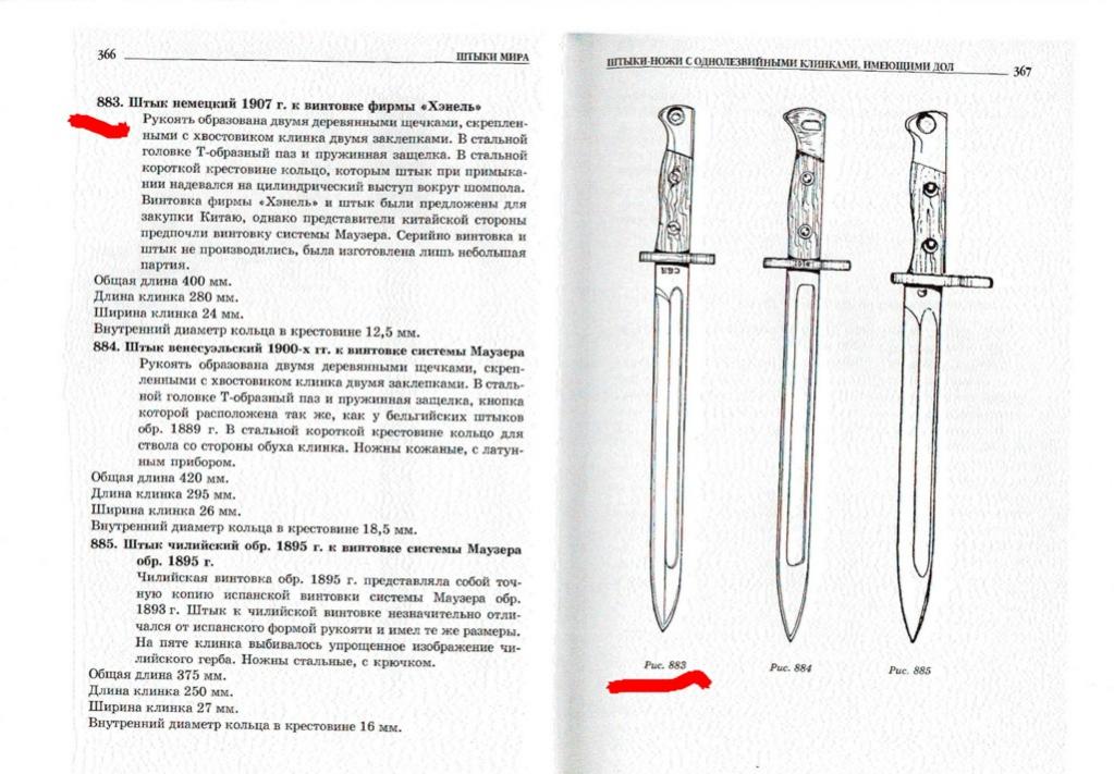 Добавляю скан из классификатора Кулинского. Под номером 883 указан штык немецкий образца 1907 г. к винтовке "Хенель". Его размеры подходят к приведенным мной ножнам на фото. Может у каго в коллекции имеется такой штык с ножнами. Тогда сообщите идентичные ли они показанным мною на фото ножнам?