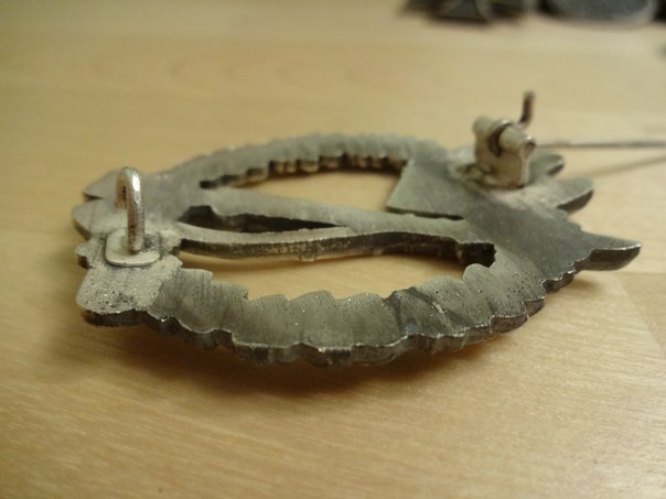 Орел: - верхний коготь орла удерживающий свастику практически должен быть горизонтальным (под очень небольшим углом)-не в 45%, оперенье (верхний угол крыльев) начинается с больших перьев-на данном знаке все маленькие, желуди на венке круглые (верхушка), а здесь больше похожи на револьверную пулю. Это что касательно литья. А про то что написал сам владелец-я тоже с этим не сталкивался-зацеп на левую сторону??? Ну а про обратку-грубая работа. Сейчас сфоткаю какие должны быть-покажу.