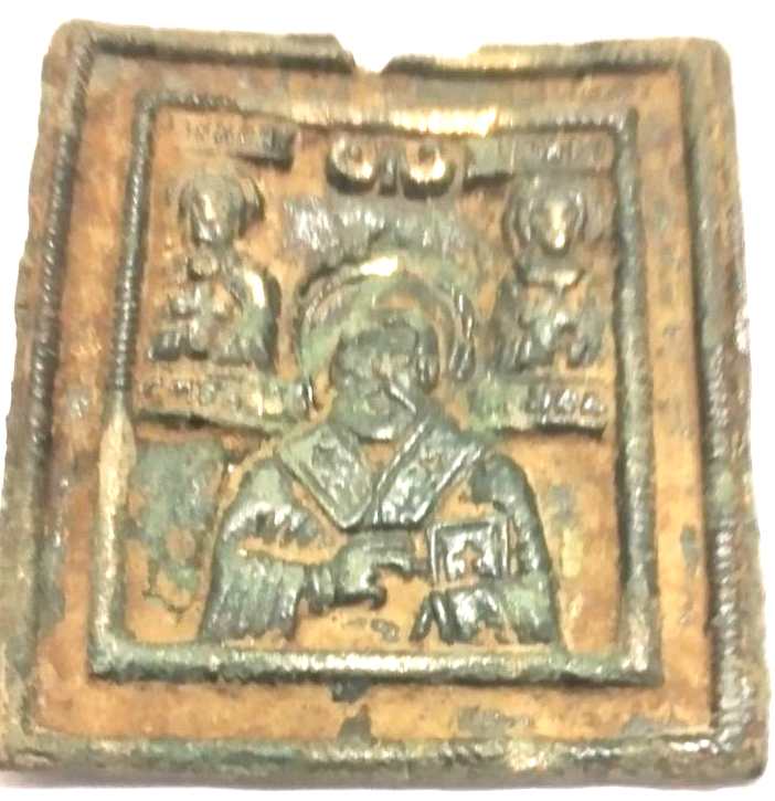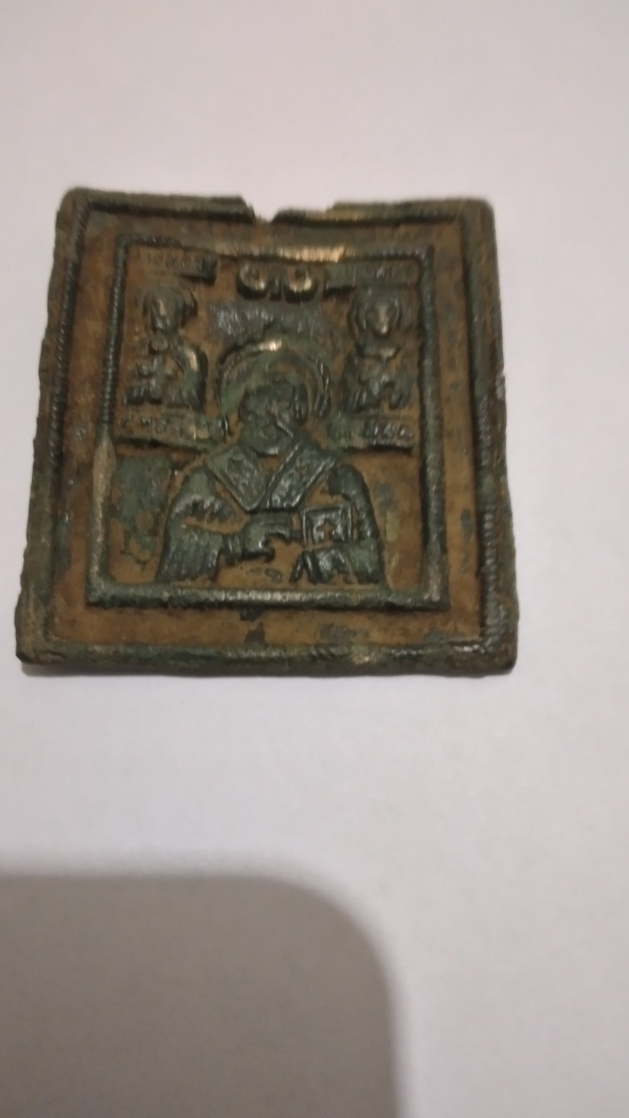 По тому, что на фото: вероятнее всего металл (бронза), литьё. Путевая икона (ударение на третий слог).