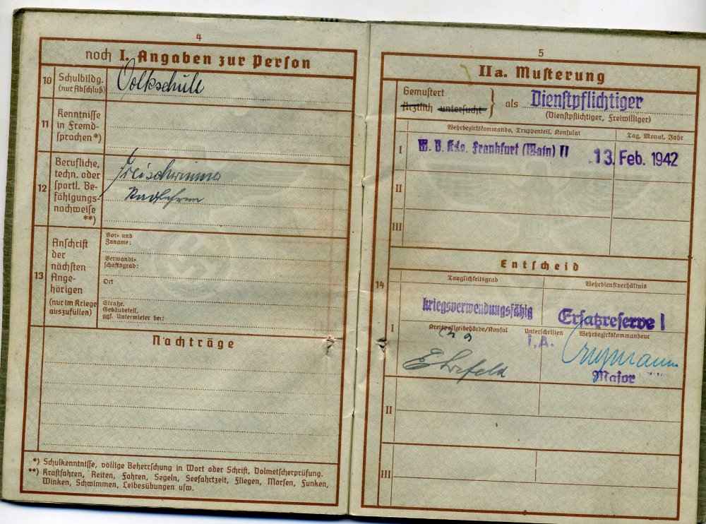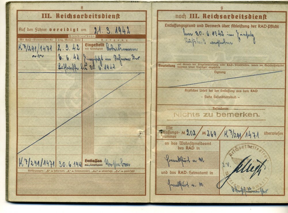 2.Уважаемые коллеги, прошу помощи в прочтении верпасса 18-летнего призывника из Франкфурта на майне, Эдмунда Вагнера, 24-го года рождения. Как я понял, призвали его 13.02.1942 в г.Франкфурт. Верпас приехал из Германии, в обложку было вложено фото РАДовцев, если я не ошибаюсь, хозяин документа в нижнем ряду, второй слева. Не знаю, оставлю ли док себе в коллекцию, или пойдёт в обменный фонд, но разобраться мне с ним интересно ! Так как буржуйскими языками не владею так как бы это было пристойно, поэтому прошу помощи у сообщества. Меня интересуют вопросы : 1. почему всё так красиво начиналось с 13.02.1942, и все так быстро прекратилось 30.06.1942 ? Помер он, что ли ? Последняя дата которая несколько раз мелькает в доке именно 30.06.1942 , а после нее идут прочерки (или вообще перечёркнуто все.). 2. куда его призвали - род войск (возможно место службы). 3. О каких шпиёнах пишут на странице 10 (типа проверка какая-то была ?). 4. что значит красная надпись на обложке, и она же на стр.34 и 36. Интересно составить хоть приблизительную картинку о судьбе этого бойца. Буду благодарен за любые версии. С уважением Вадим.