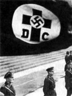 Первое фото : "Немецкие христиане" (Deutsche Christen) - движение, организованное в мае 1932 года сторонниками национал-социализма среди немецкого духовенства Евангелической церкви Германии. Возглавлялось Людвигом Мюллером. Карл Густав Юнг отмечал: Дух этого движения нашёл своё выражение в проповеди, произнесенной доктором Лангманном - евангелическим пастором и видным церковным иерархом - на похоронах Вильгельма Густлофа. Доктор Лангманн появился в форме штурмовиков, включая сапоги. В последнем напутствии он заявил, что место покойного Вильгельма в Вальхалле, в доме Зигфрида и Бальдра - героев, "пожертвовавших своей кровью ради жизни немецкого народа" (подобных - среди прочих - Христу). "Пусть этот Бог пошлёт народы земли брести, бряцая цепями, сквозь историю"... "Да благословит Бог нашу борьбу". Именно этими словами, согласно Neue Zurcher Zeitung, 1936, № 249, завершил достопочтенный пастырь свою речь. К середине 1930-х годов движение насчитывало уже около 600 000 человек. В ноябре 1932 года на выборах в Прусскую церковь "Немецкие христиане" получили треть всех мест. Празднование дня Лютера «Немецкими христианами» в Берлине в 1932 году