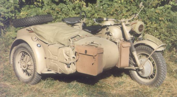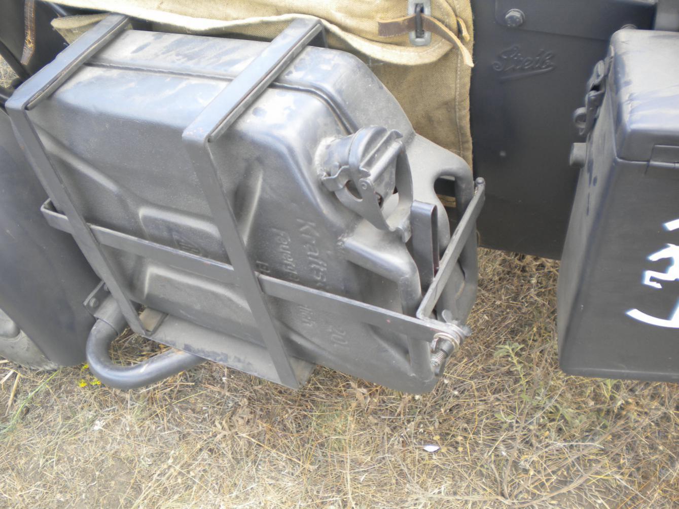 Из десятка фронтовых фоток М-72,(что есть у меня) на одной, вроде есть крепление лопаты(хоть на остальных фотках ракурс не тот) канистр естествено нету, зато часто есть сумка и яшик на коляске с переди.
