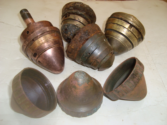 Очень часто нахожу разорванные фрагменты вот такой детали.Думал по началу, что кусочки ведущих поясков,но резьба смущает.Вот первый раз нашёл целиком.,внутренний диаметр приблизительно 60-62мм (точно не замерить предмет изогнут).