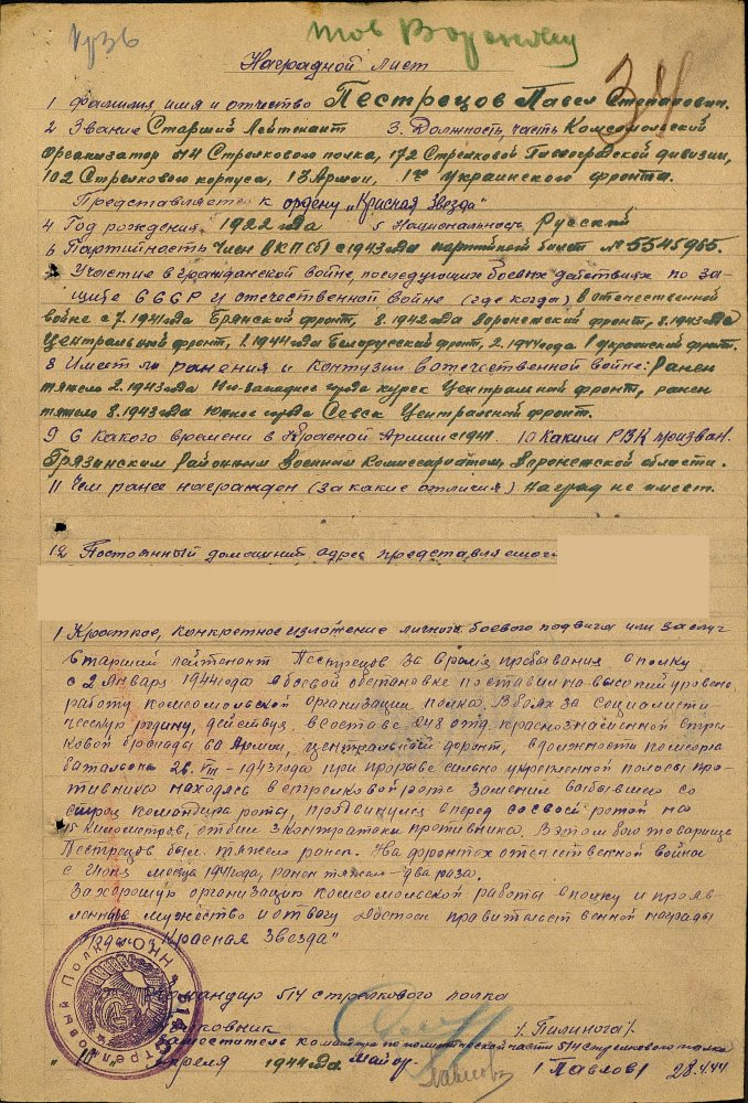 Ув. модераторы перенесите, пожалуйста, тему в ВА. Есть такой дедушка - замполит. На "Подвиге народа" данные про две "Красные Звезды" и "Отечественную войну" 1-2 ступеней. Вот один из наградных: