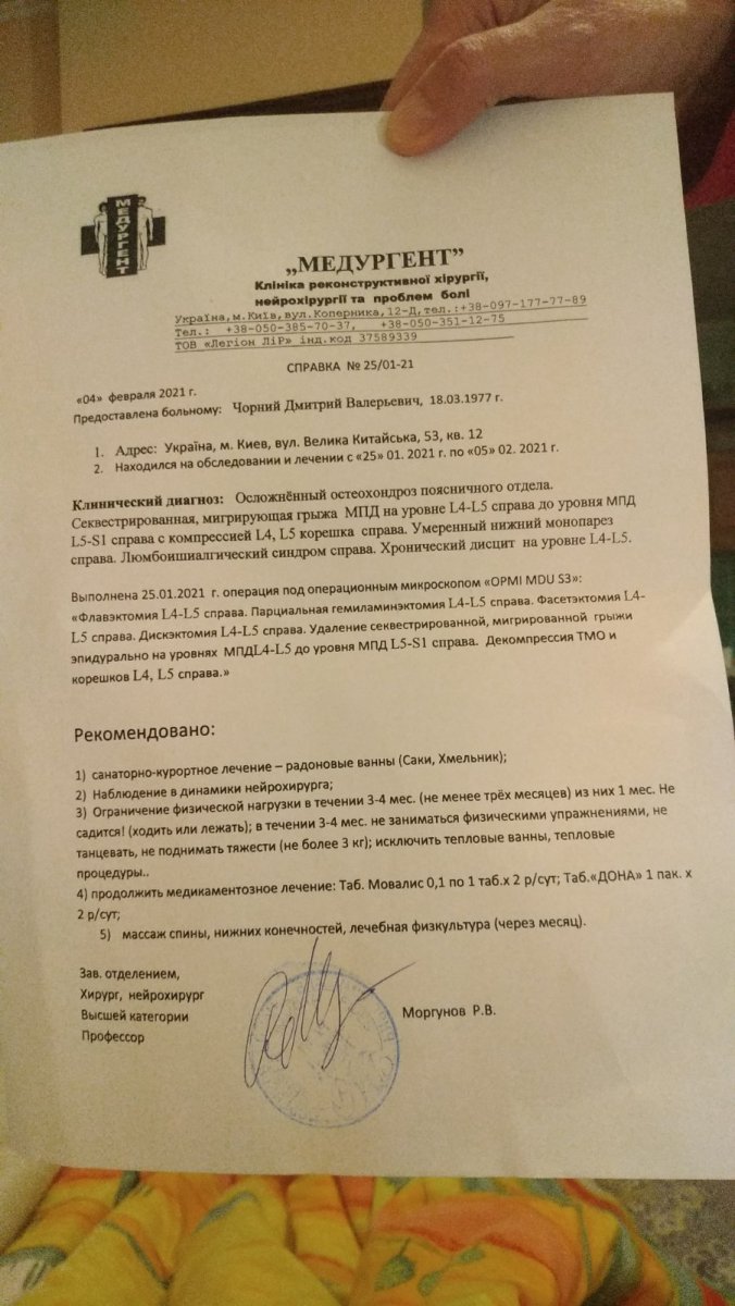 Добрый день. Форумчанин Дмитрий Черный ник "Дми-трий" перенес операцию. Диагноз мигрирующая грыжа . Просьба к неравнодушным участникам форума оказать материальную помощь. Подтверждающие документы во вложении, буду признателен за понимание.