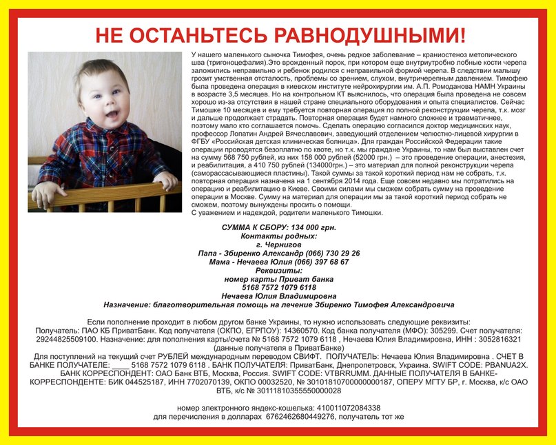 чуток поучаствовал. ребенку-здоровья, родителям-тоже, ну и стойкости. Собственно: выделил из картинки номер счета. Так проще скопировать при работе в Приват 24 5168757210796118 Нечаева Юлия Владимировна