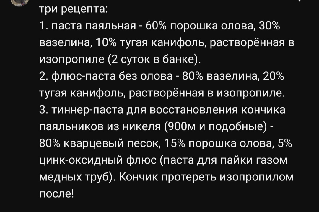 Тая хімія кустарно бодяжиться, є в ютюбі, я б теж навмисно не брав, вже краще купити нове жало. Бюджетні 900ї серії жала гірше віддають тепло через проміжок між нагрівачем та насадкою. З вбудованим нагрівачем як в тому що я викупив, віддають краще, потужність залежатиме від вольтажу, тобто або кілька блочків, або лабораторник. В мене 2 блочка 12в і 22в. На другому нагрів миттєвий. Чим добре це паяло, що можна від акума автівки заживитись, якщо є платка зміни напруги то і потужність вийде регулювати. Від 12в всього 18Вт. Від 24вольт 65Вт. Тобто і гріється швидше, і товстіше можна паяти нормально. Візьміть звичайний мідний ват на 60 , та й фіг з ним, під більшість задач, і з безсвинцевим повинен справитись мабуть.На олх їх повно на любий смак. Чи Ви смд хочете тицяти?