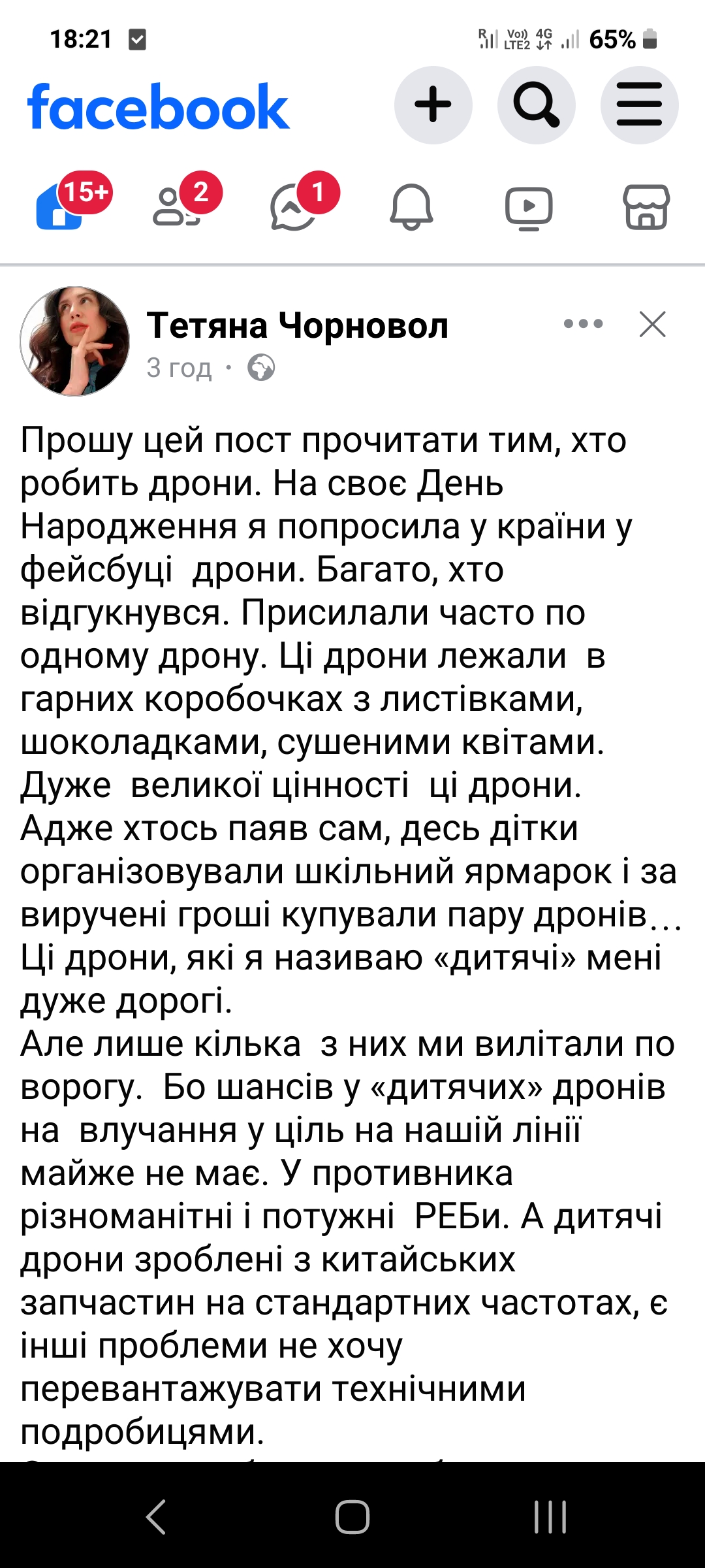 Прошу цей пост прочитати тим, хто робить дрони. На своє День Народження я попросила у країни у фейсбуці дрони. Багато, хто відгукнувся. Присилали часто по одному дрону. Ці дрони лежали в гарних коробочках з листівками, шоколадками, сушеними квітами. Дуже великої цінності ці дрони. Адже хтось паяв сам, десь дітки організовували шкільний ярмарок і за виручені гроші купували пару дронів… Ці дрони, які я називаю «дитячі» мені дуже дорогі. Але лише кілька з них ми вилітали по ворогу. Бо шансів у «дитячих» дронів на влучання у ціль на нашій лінії майже не має. У противника різноманітні і потужні РЕБи. А дитячі дрони зроблені з китайських запчастин на стандартних частотах, є інші проблеми не хочу перевантажувати технічними подробицями. Скажу лише без переробки у них не має шансів долетіти ВЗАГАЛІ. Деякі ми переробляли, але це багато роботи. Наприклад, у мене вдало полетів дрон, який самотужки зробив дванадцятилітній Максим. Ми його лише трохи переробили: відео та ініціацію. Проте провозилися теж довгенько. Бо кожен окремий дрон це окрема планета, яку треба вивчати. Є невеликі партії по 3 дрона. Зараз у мене цього добра пару десятків Думала потихеньку мій інженер переробить. Але виявилося не можу дати йому можливість працювати в майстерні, ми просто не можемо літати без нього. Ворог постійно вигадує все нові засоби РЕБу, а він постійно, щось вигадує, щоб ми долетіли. Мені дуже важливо, щоб «дитячі» дрони полетіли вдало. Дітки і дорослі українці, які мені їх прислали душу вклали. Я вірю в те, що ці дрони зважаючи на закладену в них енергетику «фартові», але і технології ніхто не відміняв. Поможіть мені, поможіть цим дронам полетіти. Зараз у мене переробці 10 дронів «Яценюка» їх взяв покращувати «Укропчик». Але то найлегший варіант, якісні дрони - просто дуже китайські і дуже стандартні. Я розумію, що з «дитячими» дронами, які по одному важко. Проте мені не треба безкоштовної роботи. Я готова платити і за запчастини і за роботу, і я скажу, що шукаю, вітаю і приймаю лише такий варіант. Бо коли я віддаю дрони для переробки на «волонтерських засадах» зрозуміло, що вони не будуть зроблені оперативно. А якщо не оперативно, то мені таке не потрібні, бо технології міняють зі швидкістю урагані. Далі, я не можу забезпечити запчастинами. Я шукаю тих, у кого є запчастини. Я, пробувала, билася, як риба об лід, я не можу оперативно купити потрібні мені антени, модулі, плати тощо. Я не буду тут пояснювати, що мені треба, бо шукаю допомоги у тих, хто знає, що наразі має шанс долетіти. Зауважу ми не безнадійно тупі. Щоб, наприклад, уникати «штори» мій інженер вигадав та реалізував переключення відеоканалів в повітрі. Але наш результат бажає значно кращого, тому радо попробуємо на перероблених дронах буд-які новинки, головне щоб це не був один дрон, а переробка хоча б 10. Взагалі шукаю постійного помічника в переробці дронів, який буде своїми запчастинами реалізовувати наші «хотелки» або пропонувати свої фантазії. Фінансово покриємо всі витрати і заплатимо за роботу, бо це велика, важка і дуже потрібна нам робота, яку треба добре оплачувати. Тим паче є можливість потрошку брати «державні» дрони, але то таке гівно, яке навіть не «попливе», якщо не переробити. І ще раз повторю, що особливо я хочу дати шанс «дитячим» дронам. Війна це не лише технології, є щось таке невловиме, намолене, 