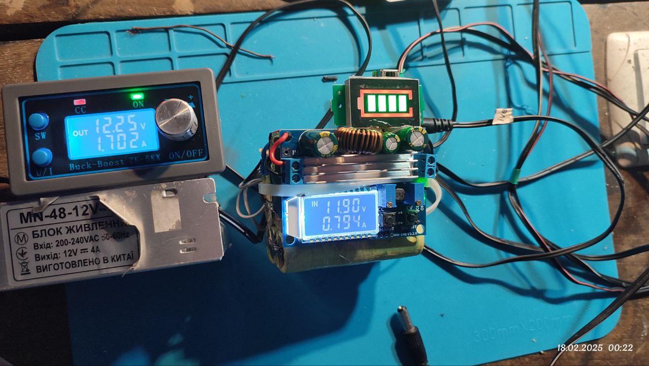 12в блок живлення (койобочка з перфорацією) до якого примастирили регульований блок живлення (койобочка з екраном і крутілкою), збірка акумуляторів з платою BMS (зелена плата), плата балансування (з конденсаторами), індикатор рівня заряду АКБ(екранчик з полосочками) і ще якась плата з екраном....
