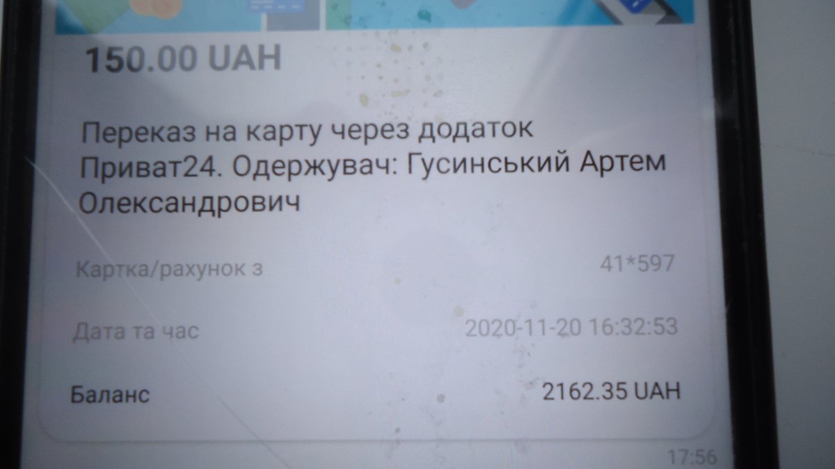 Добрый вечер. Подал заявку ещё днём. Сейчас оплатил, со сканировав код, но деньги сюда не поступили. Оплатил 100 грн. от Калиновский Сергей в 21-00. С ув ...