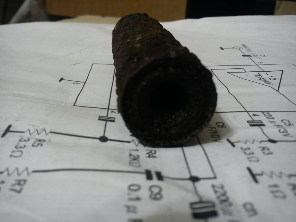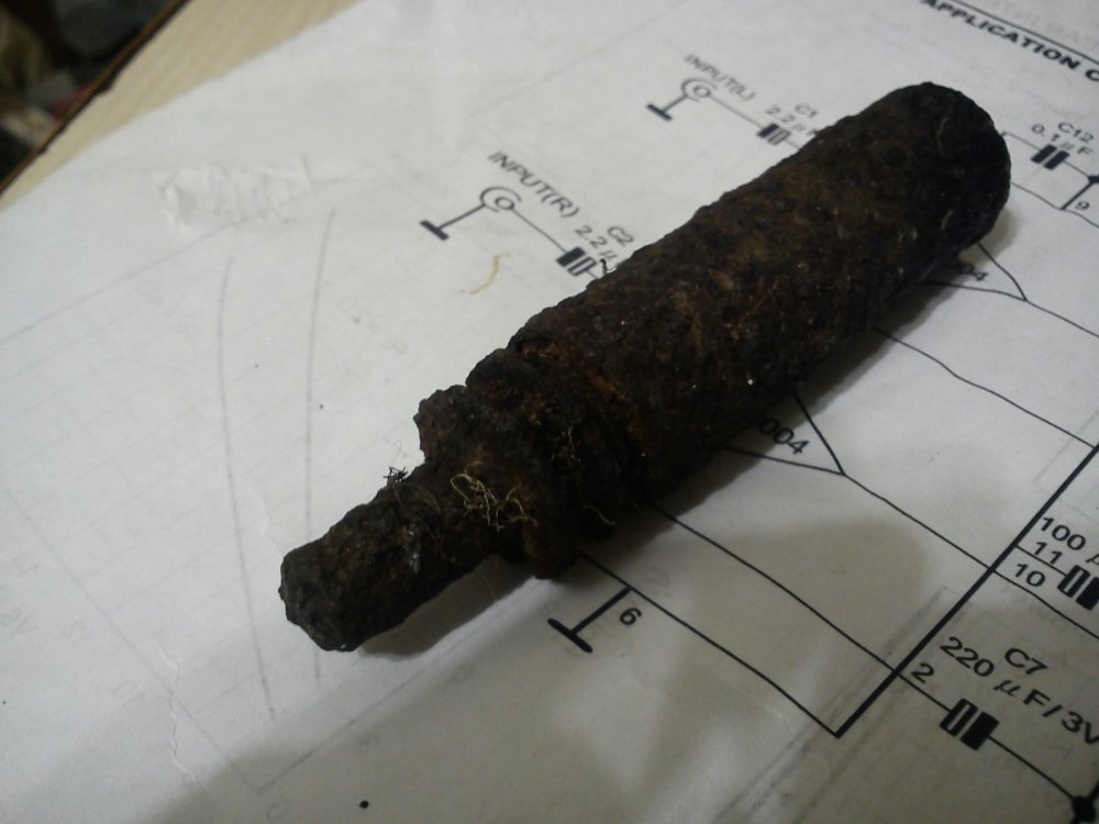 Дакой девайс напоминающий поршень, возвратного механизма, в одной из выборок просматривается резиновое кольцо. Длина 95мм, диаметр 20 мм. В отверствие есть резьба. Пустотелое. Рядом был найден подкалибер от 45мм-тровки. Не детонатор ли часом какой?