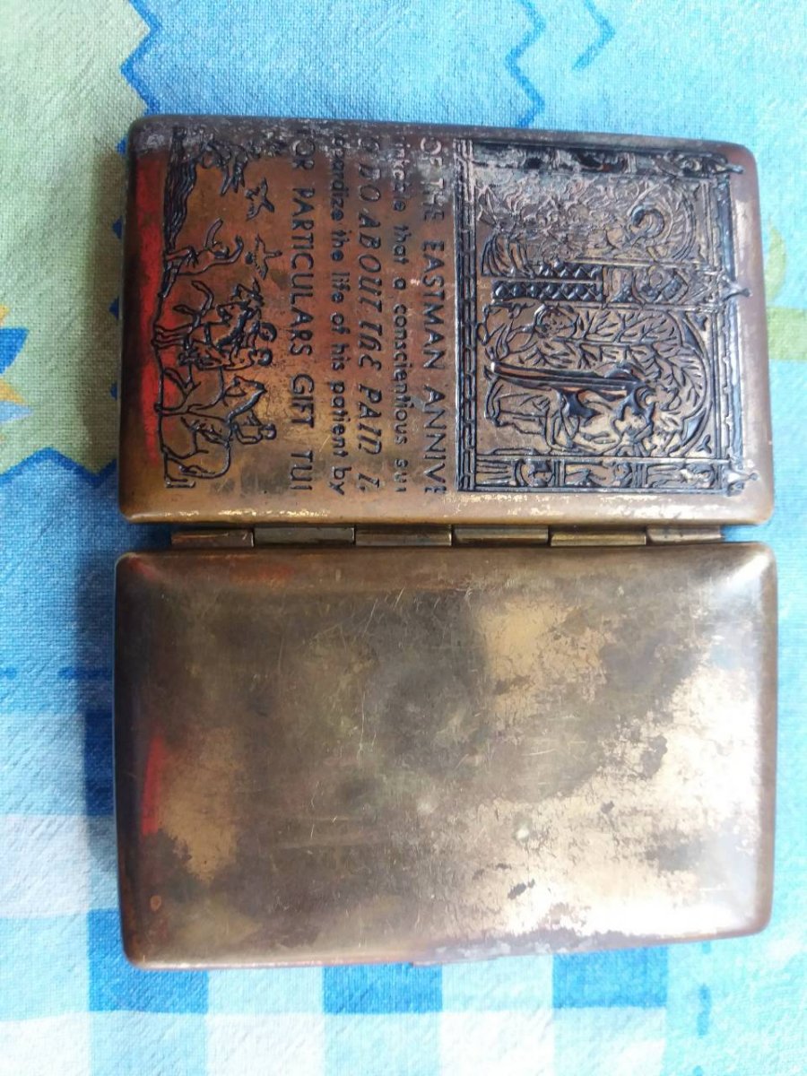 Белиберда немного выходит..Мало того, что не вместились все слова, так ещё написано скорее-всего человеком, для которого язык не родной. Возможно, что портсигар сделан из какого-то другого предмета, где была полная надпись. По надписи, что-то типа такого перевода: В годовщину(юбилей) Истмана(фамииля) Немыслимо,что трудолюбивый(добросовестный) хирург делает с избавлением(моя добавка) от боли. я бы не(?) рисковал жизнью пациена, делая.... Therefor(?) По этой причине(поэтому) специальный(особый, детальный) подарок TU(?)
