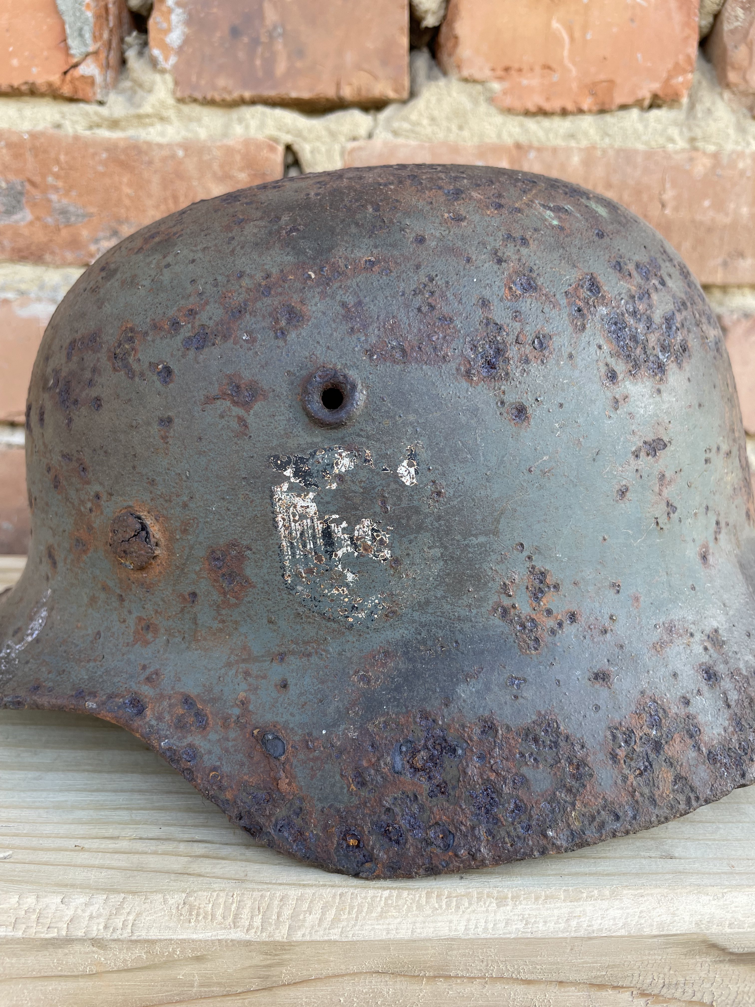 Ми розговорились, виявилось, що він вдома має каску, кірку-сокиру, штика, монети. Я запитав чи він не хоче каску продати, я навіть уяви не мав, що він принесе німецьку каску, в такому стані. Я запитав скільки за неї хоч?