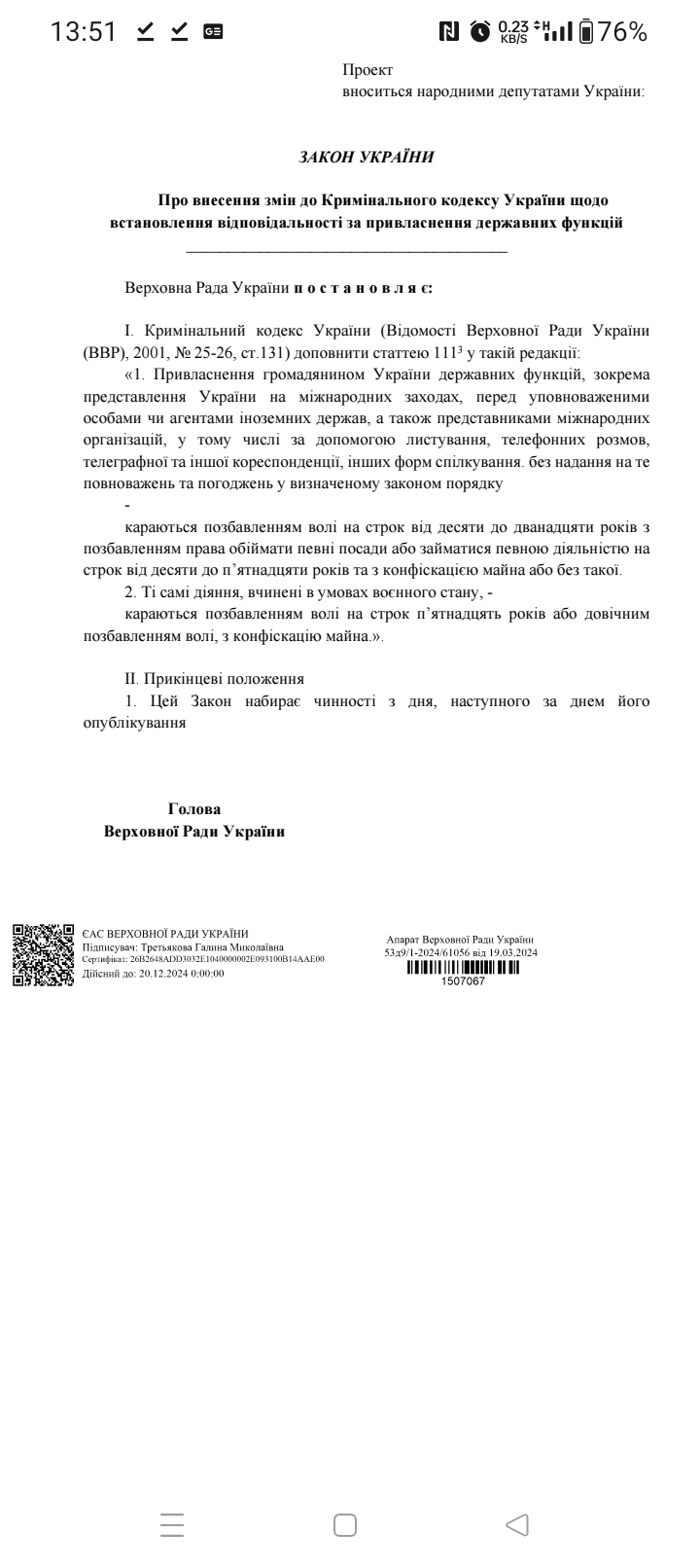 Так вона прокоментувала законопроєкт про довічне позбавлення волі за привласнення державних функцій, зокрема представлення України на міжнародних заходах, перед уповноваженими особами іноземних держав, міжнародних організацій, у тому числі за допомогою листування, телефонних розмов без надання на те повноважень та погоджень.