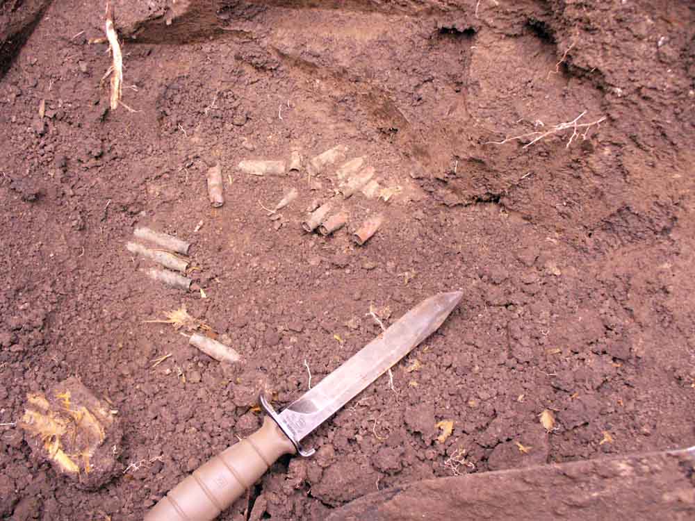 Почти такая же фигня была у меня год назад на 9 мая. Окопы, траншеи, воронки, гильзы... видно что бой был.. ходи копай, НО НИЧЕГО путевого не нашли... да еще один ( да простит он меня), чуть не подорвался мудила... не видел как граната в рубахе взрывается, настроение всем испортил и вообще превратил все в .......