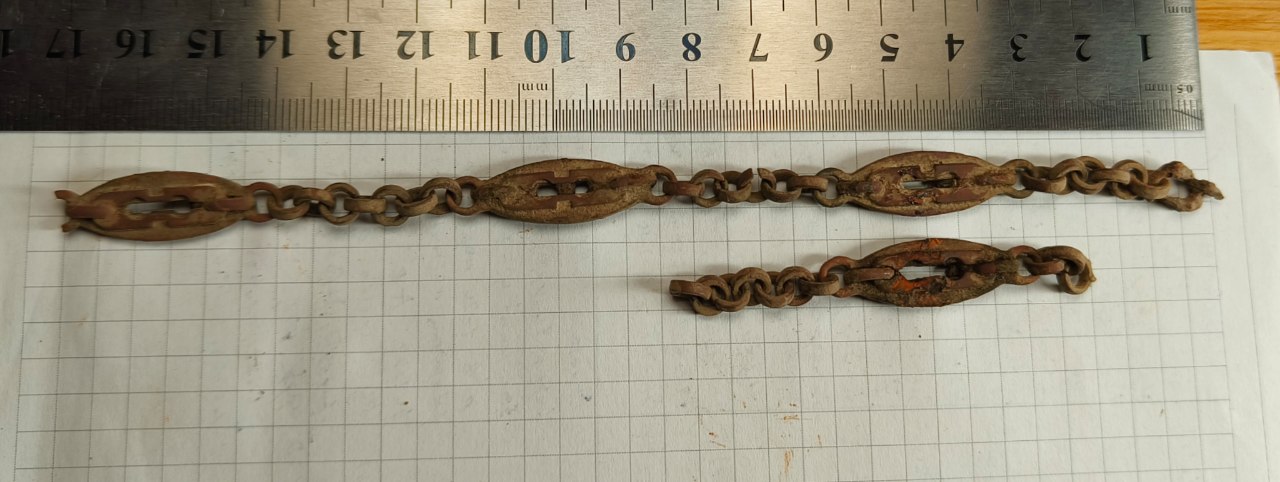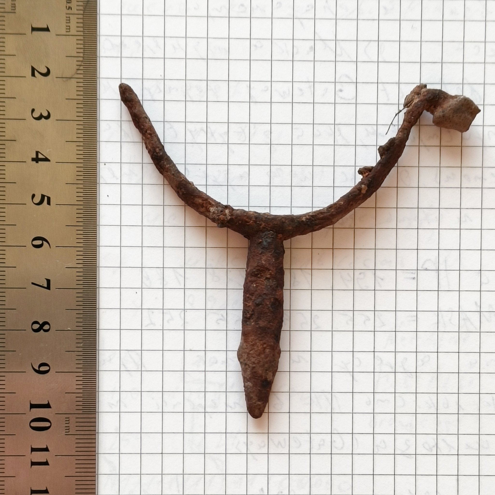 Також біля великої ями було знайдено дві круглі желізки. Виглядають так, наче в шайбу вбили цвях і загнули його. Можливо знаєте?