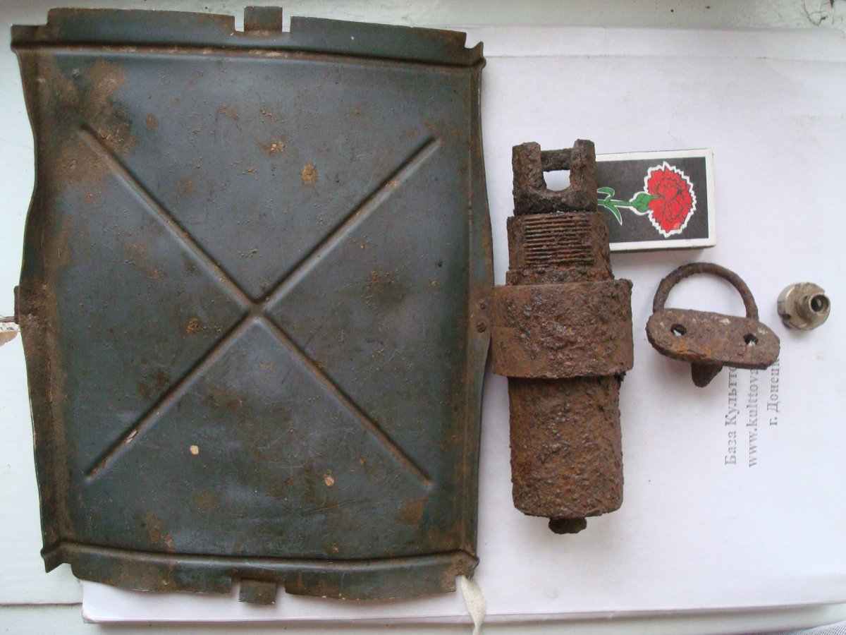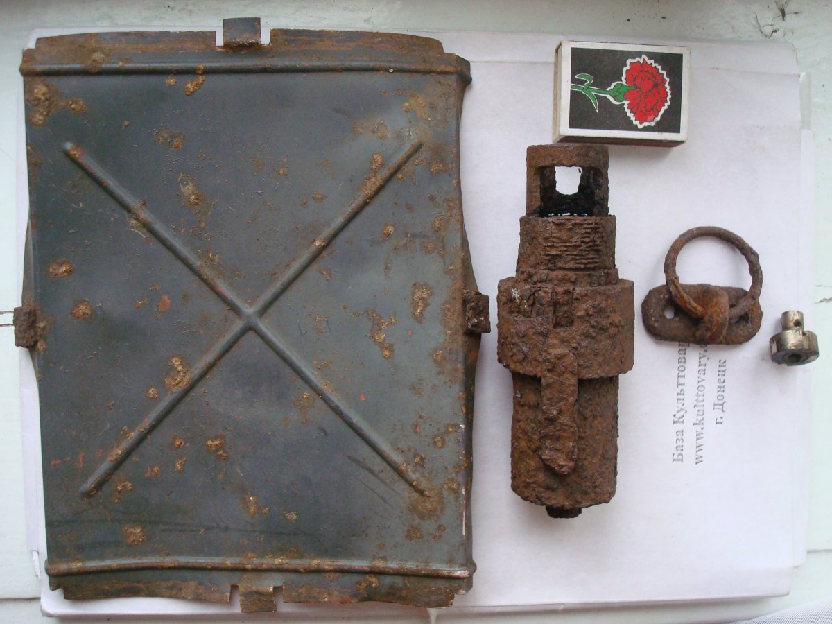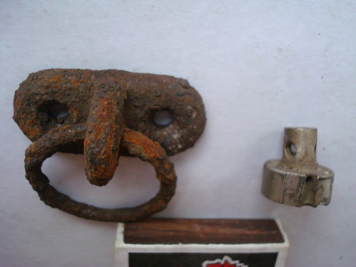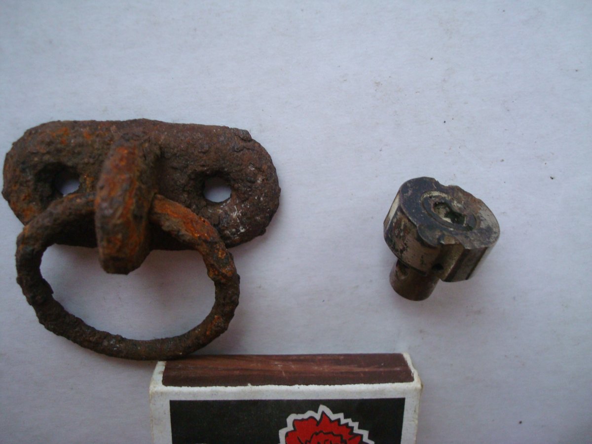 Последнее и предпоследнее фото - узел крепления цепочки на которых весели замки на телегах, полевой кухне, бронетехнике. В данном случае - телега, деревянный борт. Были два шурупа.