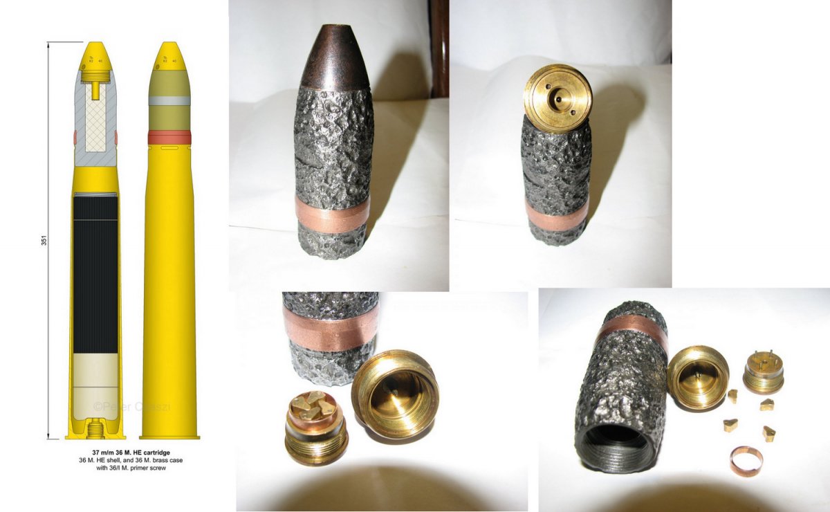 Снаряд - Венгр. Осколочник 37 миллиметров. Взрыватель к нему безопасен (нет капсюля-детонатора). А что у снаряда внутри - Вам там виднее. Второй предмет мне видится взрыватель Fl.-Es.Mi.Z. - FlaschenEisminenzünder - гидродинамический для подлёдных мин - Fl.Es.Mi.42 - Flascheneismine 42. Вернее его часть. Капсюль-детонатор отсутсвует.