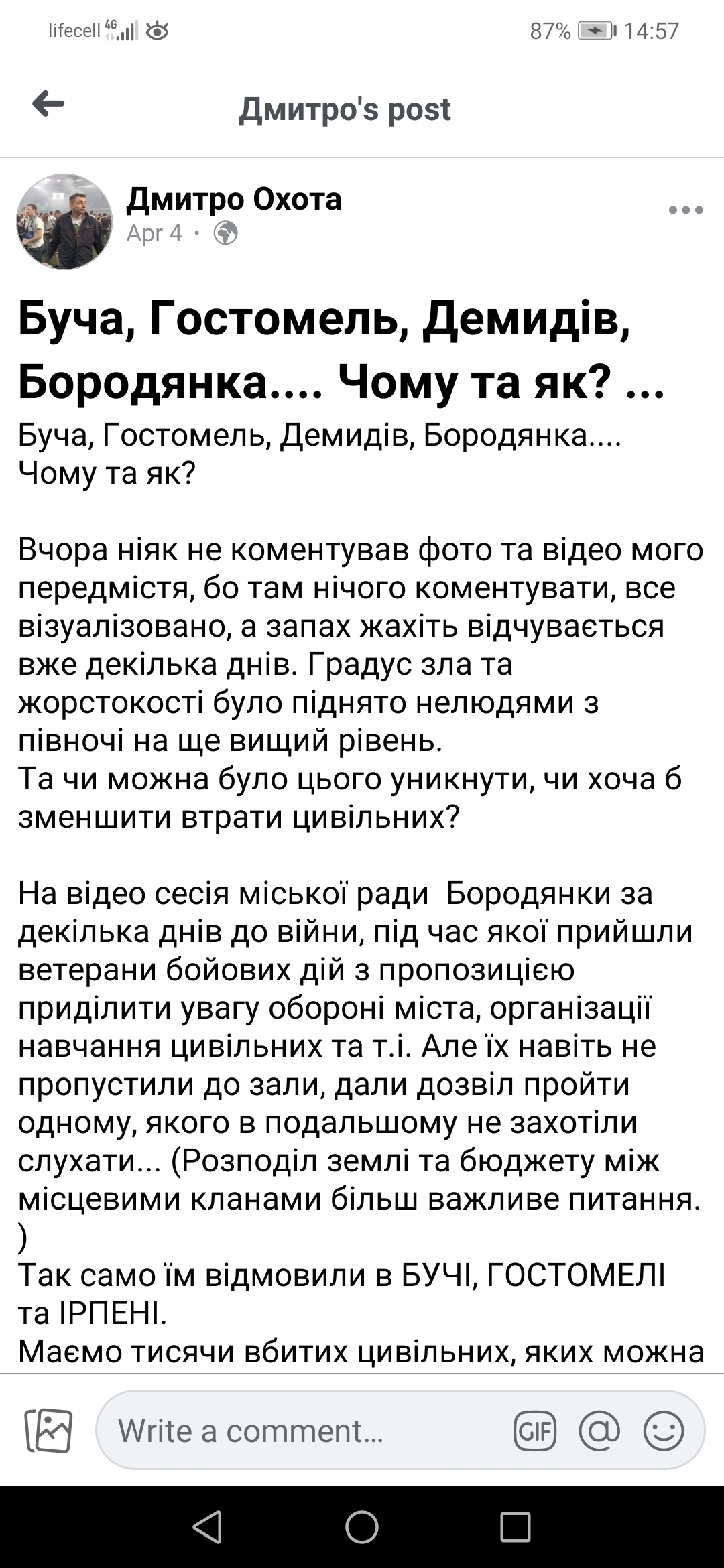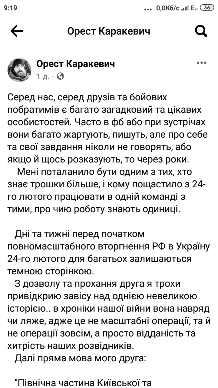 Низка подій глазами спецури. Хрипата зелена мавпа кинула шукати мир у складках крайньої плоті путіна, вдягла зелену футболку та косить під Черчиля, її піарщики строчать низковартісні папірці про ключову роль мавпи в Перемозі України, підмінюючи реальність на казки. А ми повинні пам'ятати як воно було насправді. Серед нас, серед друзів та бойових побратимів є багато загадкових та цікавих особистостей. Часто в фб або при зустрічах вони багато жартують, пишуть, але про себе та свої завдання ніколи не говорять, або якщо й щось розказують, то через роки. Мені поталанило бути одним з тих, хто знає трошки більше, і кому пощастило з 24-го лютого працювати в одній команді з тими, про чию роботу знають одиниці. Дні та тижні перед початком повномасштабного вторгнення РФ в Україну 24-го лютого для багатьох залишаються темною сторінкою. З дозволу та прохання друга я трохи привідкрию завісу над однією невеликою історією.. в хроніки нашої війни вона навряд чи ляже, адже це не масштабні операції, та й не операції зовсім, а просто відданість та хитрість наших розвідників. Далі пряма мова мого друга: "Північна частина Київської та Чернігівської області завжди були якимось віддаленим від метрополій, не відсталими, але тихими, безтурботними і романтичними районами. Далі Катюжанки сама природа вже була напівдикою. Іванків, Оране, Страхолісся - останній навіть з урахуванням дач у прибережній зоні все ж таки домінував у затишші. Також Чернігівська область, Славутич, Лошакова гута, Дніпровське та ближні до них села. Краї з піщаними дорогами, де сосни, болота, озера та просто величезна територія, не захоплена урбаністикою. 2021 рік, квітень - створив такий собі "сюрприз", як навчання військових Росії в Криму. Повернувся до Києва, обговорюючи будь-які можливості та варіанти вторгнення з півдня. Багато ветеранів готувалися до так званої тихої війни. Це означало, у разі якихось протестів у південних областях, висування туди в цивільному, н-ну кількість військових для подальшого поповнення підпілля проти місцевих колаборантів і можливих гостей з Криму чи РФ під виглядом місцевих. Нагадаю, що офіцери у спецслужбах діяли і ці операції підтримували. Вторгнення не було, але кількість військ у Криму давала зрозуміти, що все ще попереду, і те, що не сталося у квітні-травні, буде пізніше. Літо, осінь, безтурботні часи... Афган - операція з порятунку дипломатів і громадян України та громадян інших країн, які потребували евакуації. Поки всі жили своїм життям, для нас з'являлися перші сигнали про те, що Росія акуратно, та й грубо, почала накопичувати сили в Білорусі. Під виглядом навчань ввозилося техніки в десятки разів більше, аніж за всі попередні роки навчань До початку нового 2022 року ця картина з технікою та кількістю особового складу все більше і більше набувала загрозливого характеру і давала зрозуміти, що є висока ймовірність вторгнення з Північного напрямку. Цей пост, або скажімо так, стаття написана нами, як елемент історії, щоб багато фактів не забувати, та й дати зрозуміти, чи змогли б ми, ви - уникнути вторгнення або дати відповідь ще на початковій стадії. За моєю особистою ініціативою та співробітниками деяких спецслужб було організовано кілька, скажімо так, мікро груп, до яких входили ветерани та просто друзі, кому не байдужа ситуація з можливим військовим конфліктом
