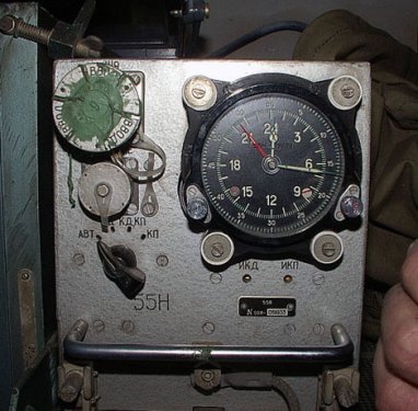 Часы 55М. "Часовой "блок 55М" предназначен для измерения текущего времени в часах и минутах и коммутации электрических цепей в соответствии с заданной временной программой в авиационной технике. Часы устанавливались на один из блоков системы опознавания "6201" (свой-чужой) и предназначались для автоматического переключения кодов опознавания самолётного радиолокационного запросчика-ответчика. Имеют встроенный блок переключателей и, в отличие от обычных часов, 24х-часовой циферблат, для исключения двойного срабатывания в сутки. Шкалы и стрелки покрыты светомассой ВРЕМЕННОГО(!) действия (к радиоактивности не имеет никакого отношения), которая обладает эффектом остаточного свечения в темноте после облучения обычным светом, или яркое свечение в темноте под действием ультрафиолетового облучения арматуры АРУФОШ, применяемой для подсветки приборов самолётных кабин. Красная стрелка предназначена для установки времени срабатывания контактной группы. Так-же происходит автоматическое срабатывание в 24.00. Система "6201" стояла на всех самолетах и вертолетах МО СССР(РФ). Скорее всего и сейчас стоит. Прибор выпускается Челябинским часовым заводом...."