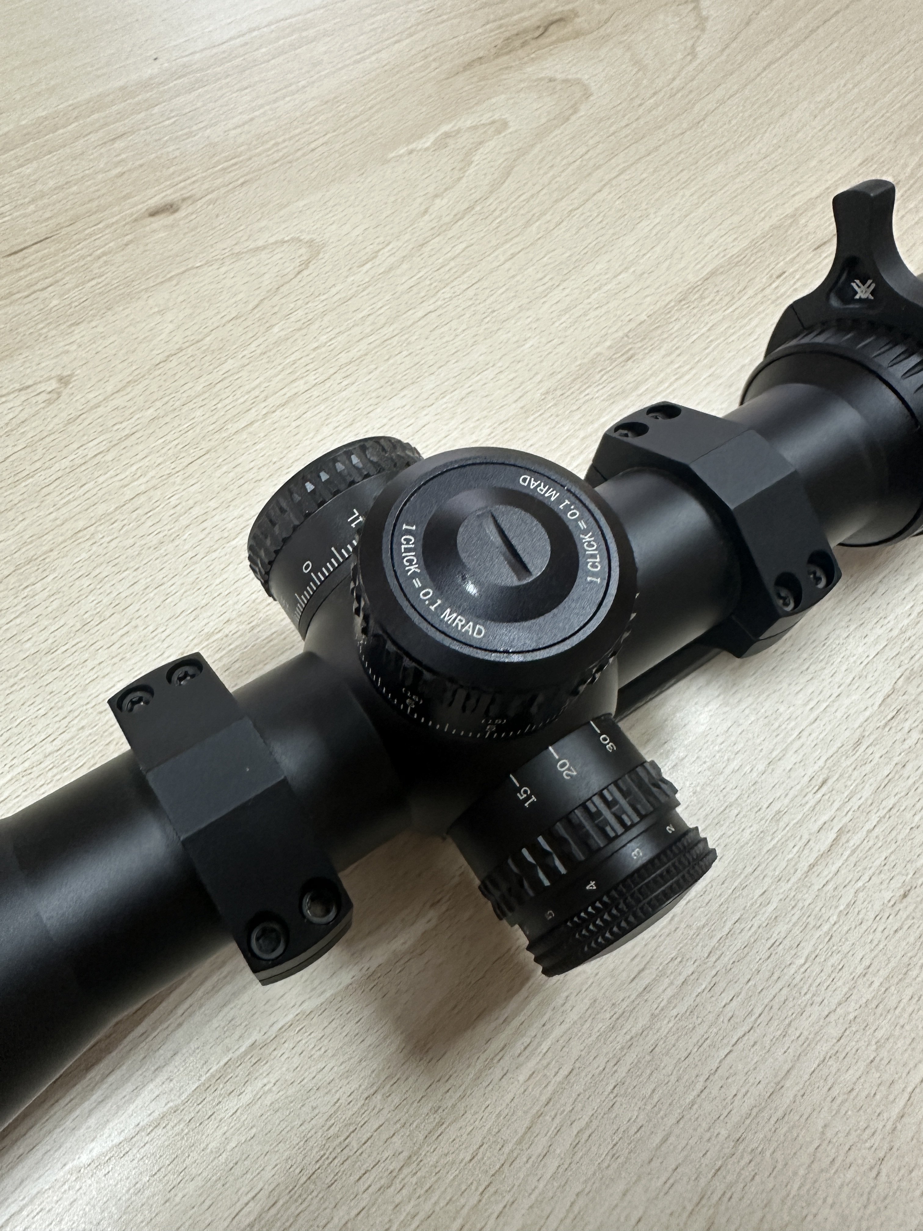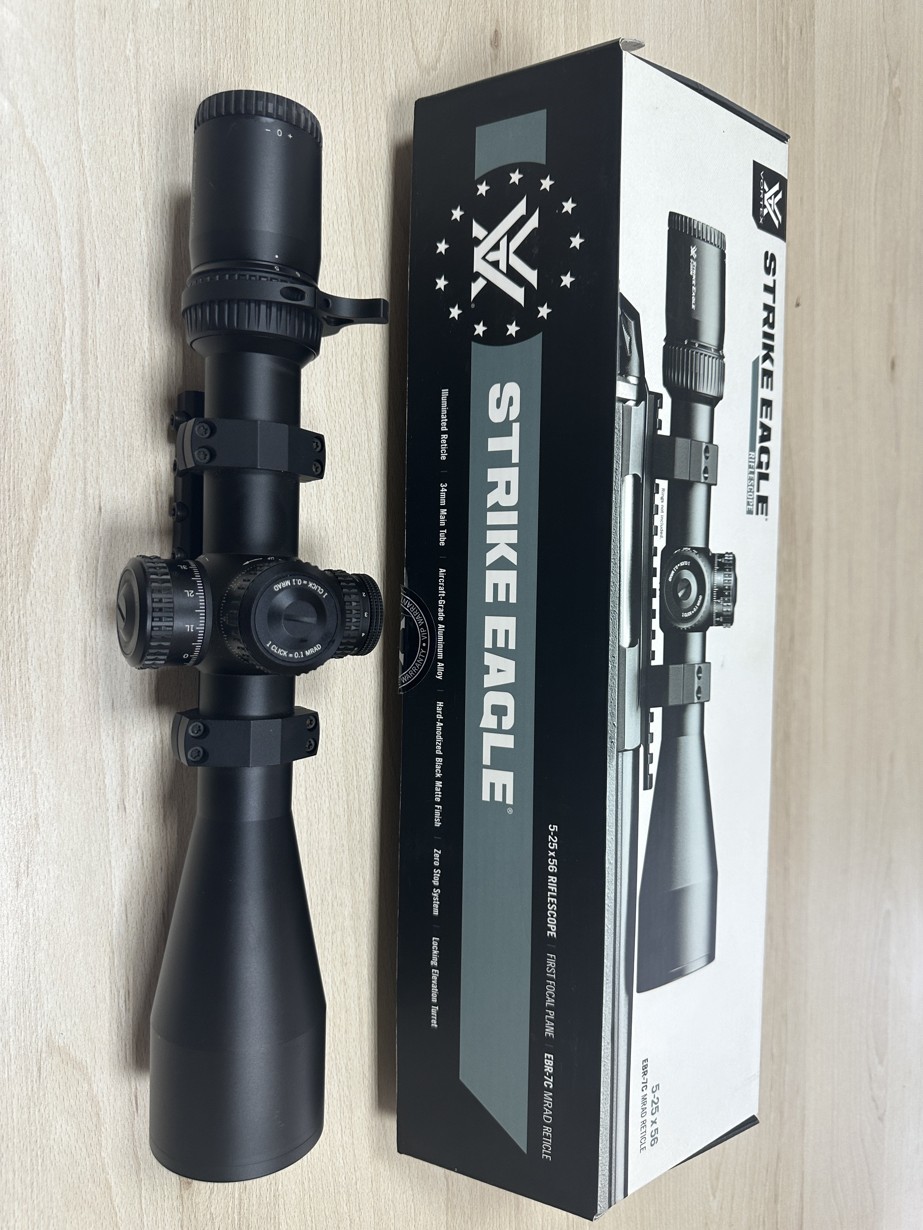 Vortex Strike Eagle 5-25X56 FFP EBR-7C характеристики: Диаметр объектива 56 мм, оптическое увеличение 5-25х; Диаметр центральной трубы 34 мм; Линзы объектива из стекла со сверхнизкой дисперсией XD™; Окуляр с механизмом быстрой фокусировки, в комплекте кольцо с упором для пальца; Вынос выходного зрачка 93 мм, поле зрения 4,2°-1,4°/ 7,3 х 2,4 м на 100 м; Отстройка от параллакса боковым барабаном от 15 ярдов до бесконечности; Многослойное просветление оптики, дополнительное покрытие АрморТек® устойчиво к царапинам; Гравированная сетка EBR-7C (MRAD), аналог снайперского «Хорус»; Подсветка сетки 11 уровней яркости, расположение – FFP (первая фокальная плоскость); Шаг выверки ¼ MOA, диапазон ввода 110/78, один оборот 25 MOA; Патентованная система сброса на новый ноль RevStop™ Zero; Высокоточные запираемые турели тактического типа; Корпус из авиационного алюминия Т6 – 6061; Полностью водонепроницаемая конструкция; Ударная стойкость до 11000 Дж Cal. 300PRC, 338LM, 408 CT; Азотное заполнение для защиты от запотевания; Диоптрийная корректировка окуляра; Длина 370 мм, вес 0,86 кг; + Моноблок Mark AR 34мм. https://stvol.ua/catalog/monoblok-leupold-mark-ar-34mm/p8674 состояние нового (2 выезда на АР 15 (223)) Цена 37000 грн. за комлект,