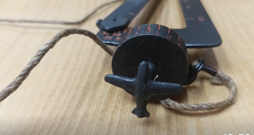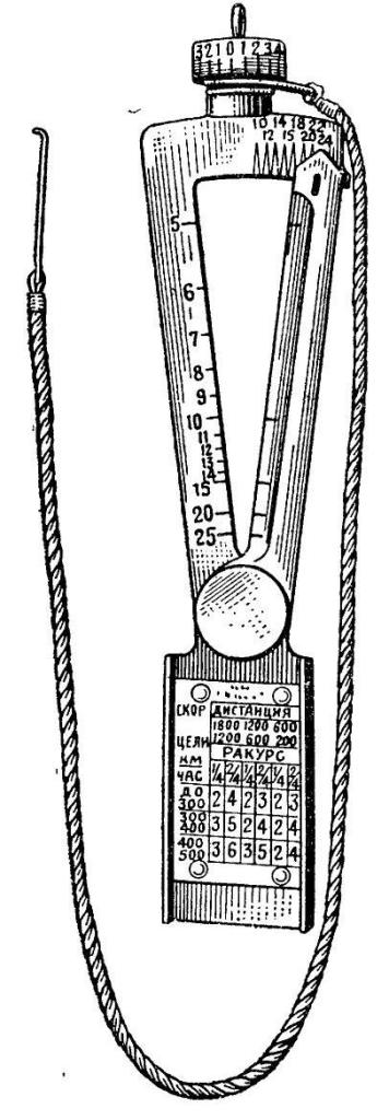 г) Повернуть весь раккурсомер-дальномер так, чтобы модель самолета на приборе встала параллельно движению цели. С барабанчика, удерживаемого на месте натянутым шнурком, отсчитать величину раккурса и, если нужно, округлить до ближайшей четверти.