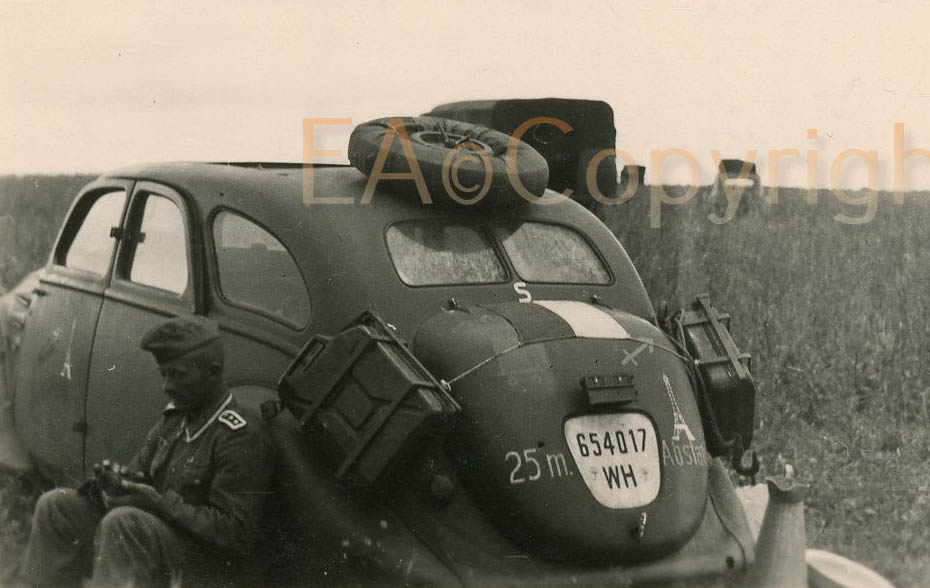 2.Крепления для запасных канистр на трофейной легковушке Peuogeot 302/402.Крепление запасного колеса вынесено на крышу.