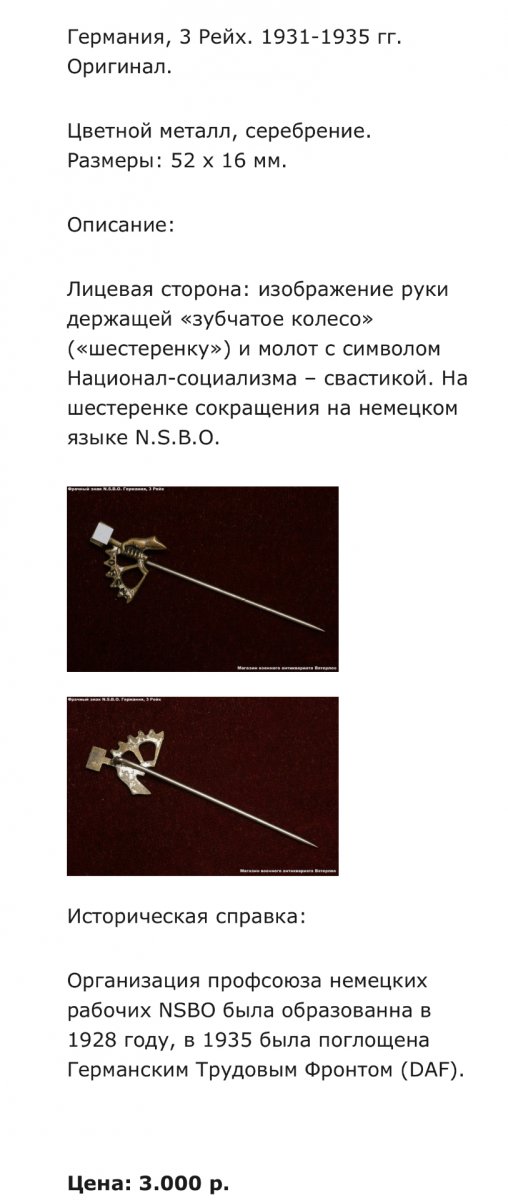 Значок или накладка на пряжку НСБО «имперской организацией немецких заводских ячеек».Если это фрачник то предел цены до 1000гр по состоянию и как повезёт.Но мне видится,что это накладки на пряжку NSBO,были варианты таких пряжек.По пряжуле скажу,что она не частая,но особо не популярна среди коллекционеров.В каталоге Анголии она значится как нейтральная.По цене думаю около 2000гр по состоянию.Если будет продаваться то дайте знать.Пряжка в принципе мне интересна.Желательно конечно подробное фото.Должны быть клейма.