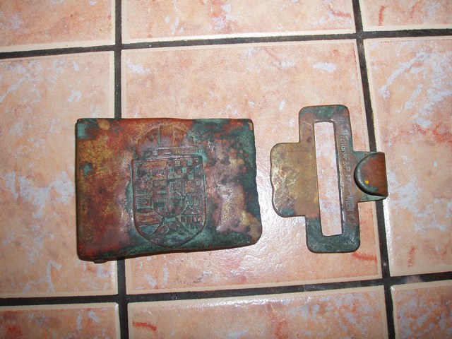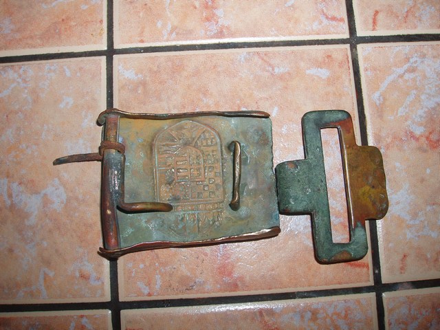 Пряга с зацепом ( ремень , с сожалению , восстанвлению не подлежал,рассыпался в руках ) найдены на стройке при разборке старого дома .Один ус отломлен и хозяин прицепил стальной гвоздь . Пряга не чистилась , только помыта водой .Предположительно Австро-Венгрия по ПМВ. Материал - латунь.Цена предмета 65 $ .