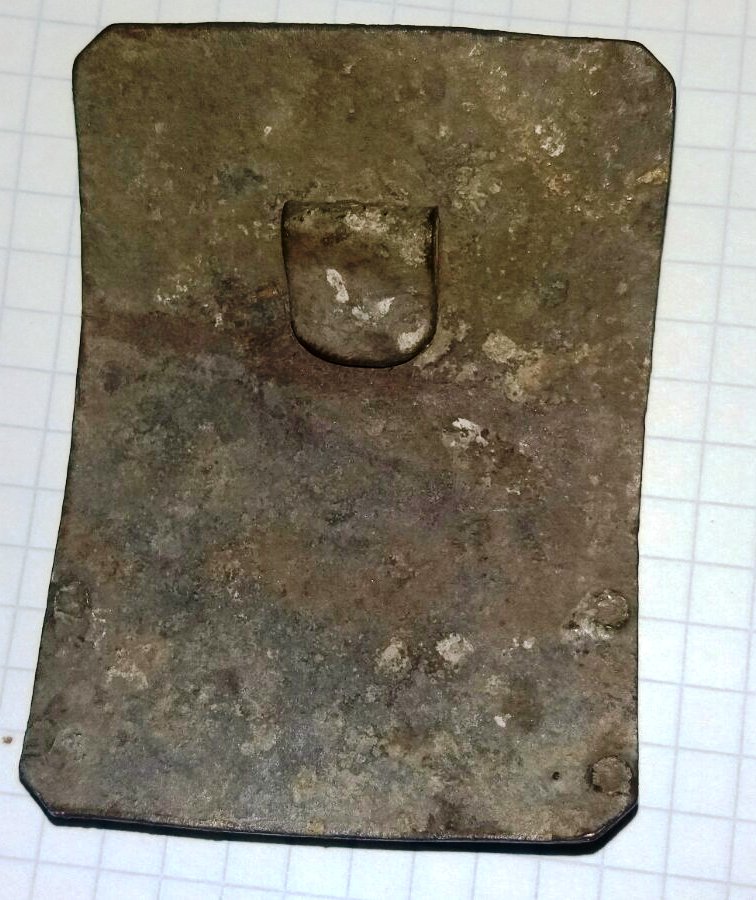 Всем Спасибо! Пряга ужеу меня.Пока был у друга зафотал еще детальку с тех мест,подскажите что за шторка.Похожа на шторку к замку,но великовата,может сундук,или маловероятно книга,а может вообще другая тема,деталь бронза.5,5 см длина.3 см ширина.видны места облома(обвел синим маркером)Спасибо!