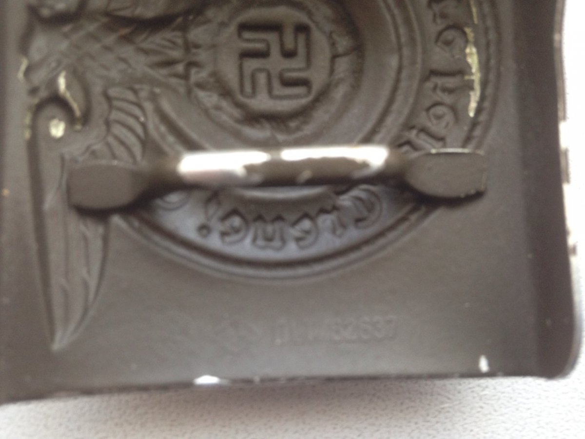 Производитель - 822/38 (Richard Sieper & Sohne). Встречается три типа клейм, на пряжках СС, выпуска 1938 года.