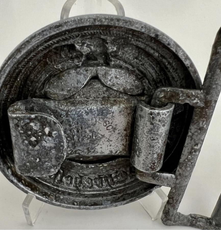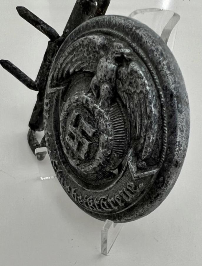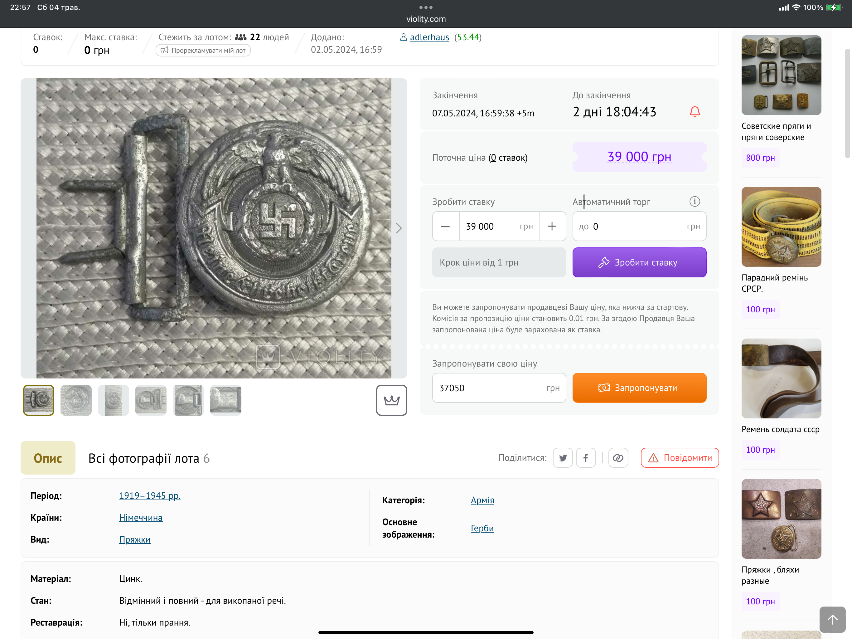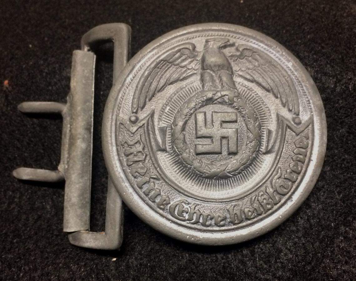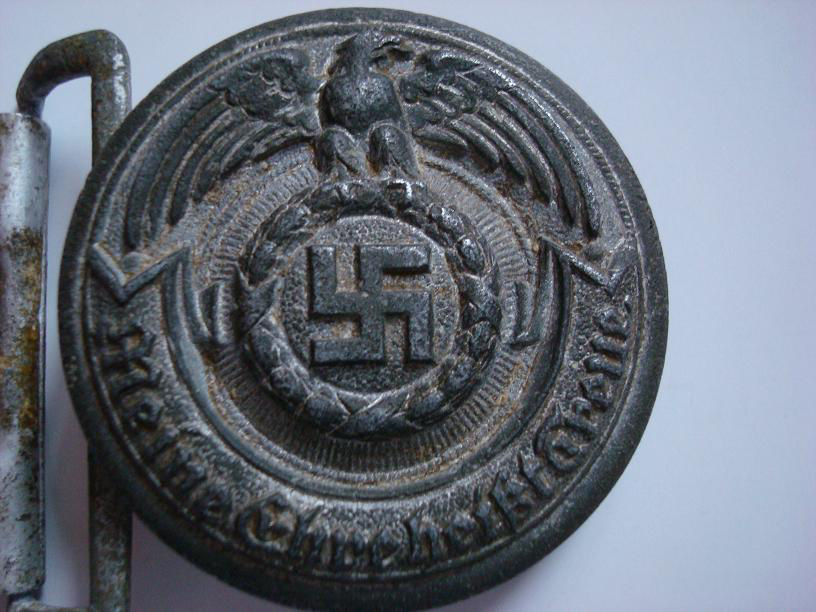 Приветствую. Если Вы хотите получить аутентификацию и оценку вещи, будь те любезны, делайте нормальные фотографии, на которых можно что-то увидеть. Кроме общих очертаний предмета, в данном случае, похожего на офицерскую цинковую пряжу СС фирмы Оверхофф на конец войны, выводов из ваших фотографий сделать нельзя. Как пример прикрепляю нормальные фотографии оригинальной пряги СС этого типа и производителя, на каторую ваша похожа по очертаниям. Что же касается цены, уже довольно длительный период времени пряга этого типа и производителя также копаная, но в более хорошем состоянии продается на соседнем ресурсе за 39 тыс. Грн. Для того, чтобы оценить адекватно вашу, нужны нормальные фотографии для того, чтобы увидеть все проблемные места. С уважением, Илья