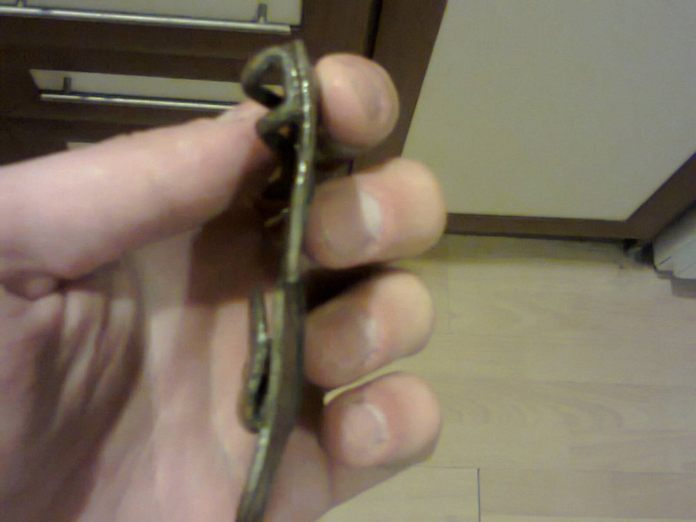 Трещина,ИМХО,итог дембельского рукоблудия,когда пряга сгибалась дугой.Вследствие чего происходит довольно сильная нагрузка на металл,от чего он может дать трещины в толщине металла,а так как она прямая,то смею предположить,что её выровняли ударом об асфальт/кирпич/бетонный пол после чего она и треснула.Такую манипуляцию,как мне рассказывали(сам не служил,так что за что купил-за то и продаю),проводили с духами,которые не "по чину" изгибали пряжку.Вариант попадания её на огород:кто-то из пацанов носил отцовский/брата ремень,попал под чью-то горячую руку и был подвергнут разгибанию пряги,т.к. не служил и дембельскую прягу носит незаслуженно(сам такому был свидетелем).Затем она с разным пацанячьим "хабаром"(гильзы,ящик от лент к Максу и т.п.жбонью) могла быть выброшена или прикопана в огородеВообщем как-то так,с уважением!