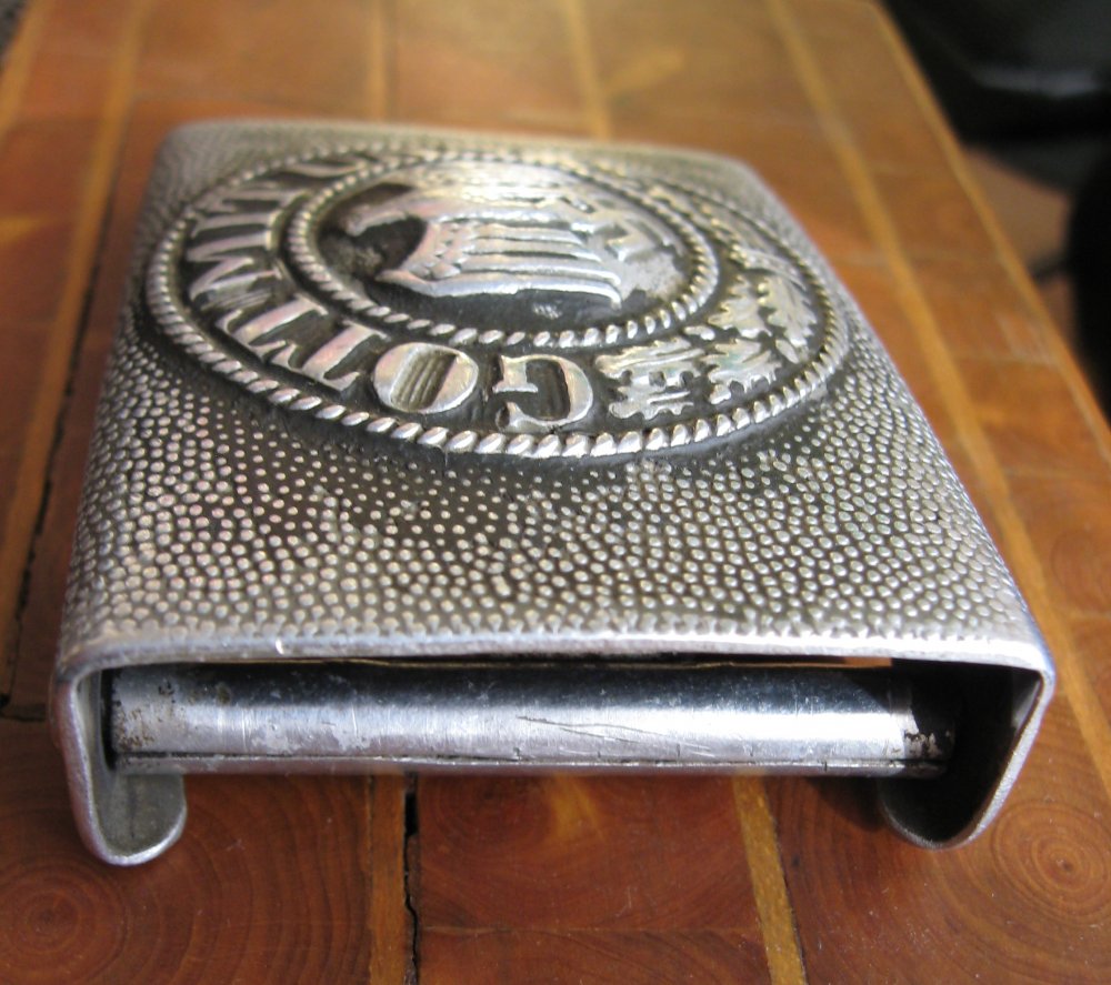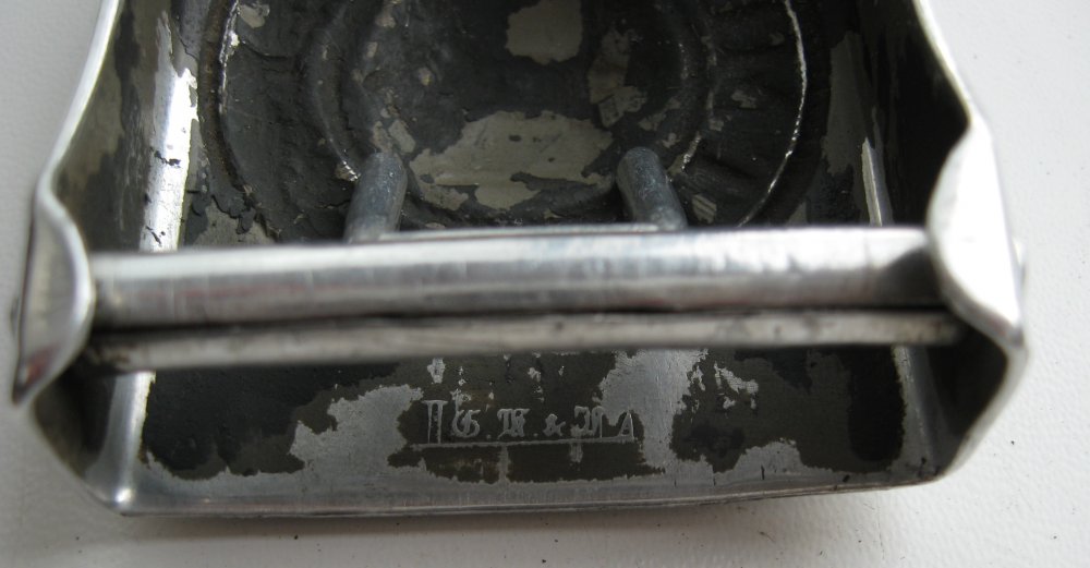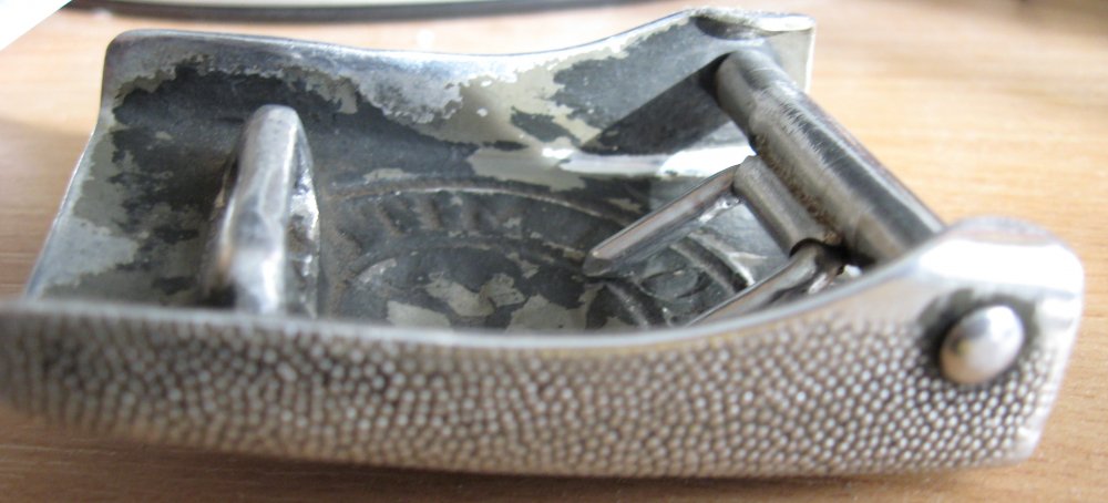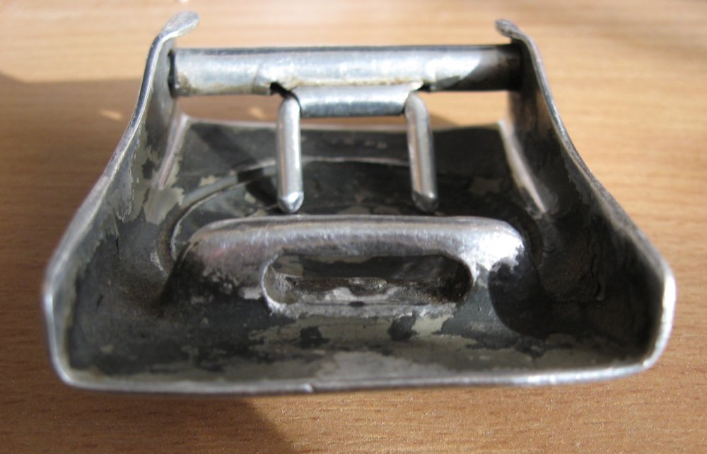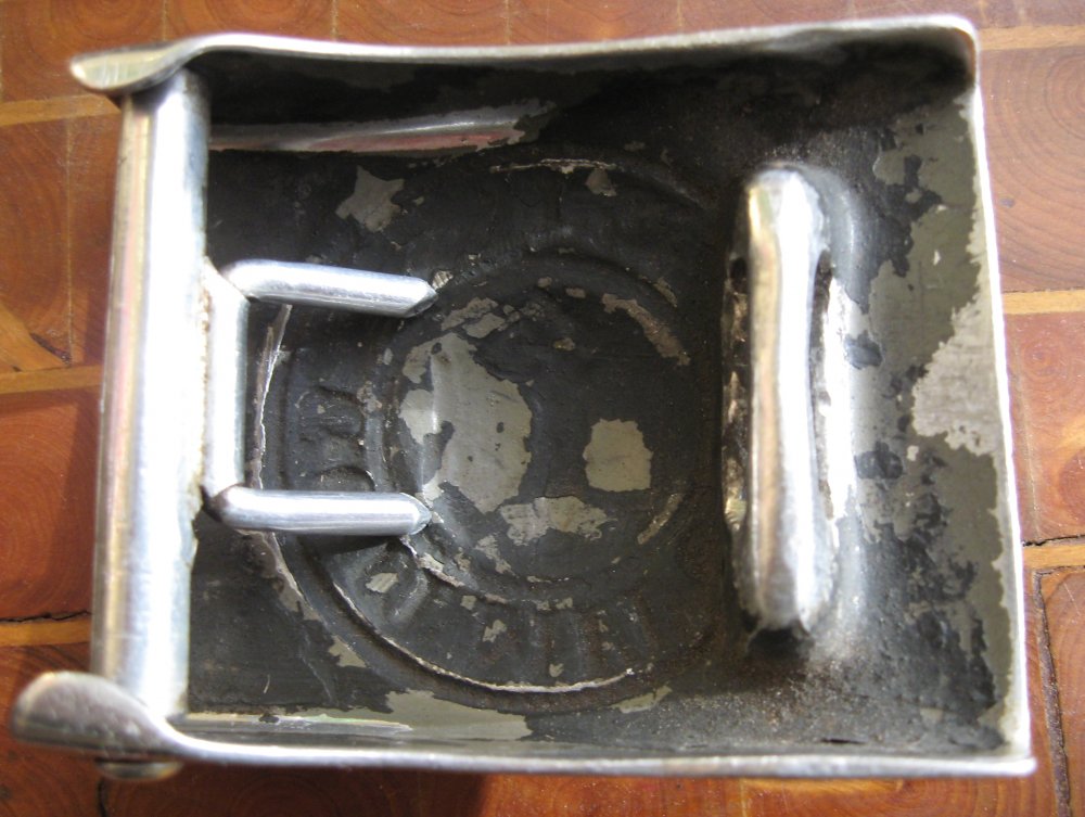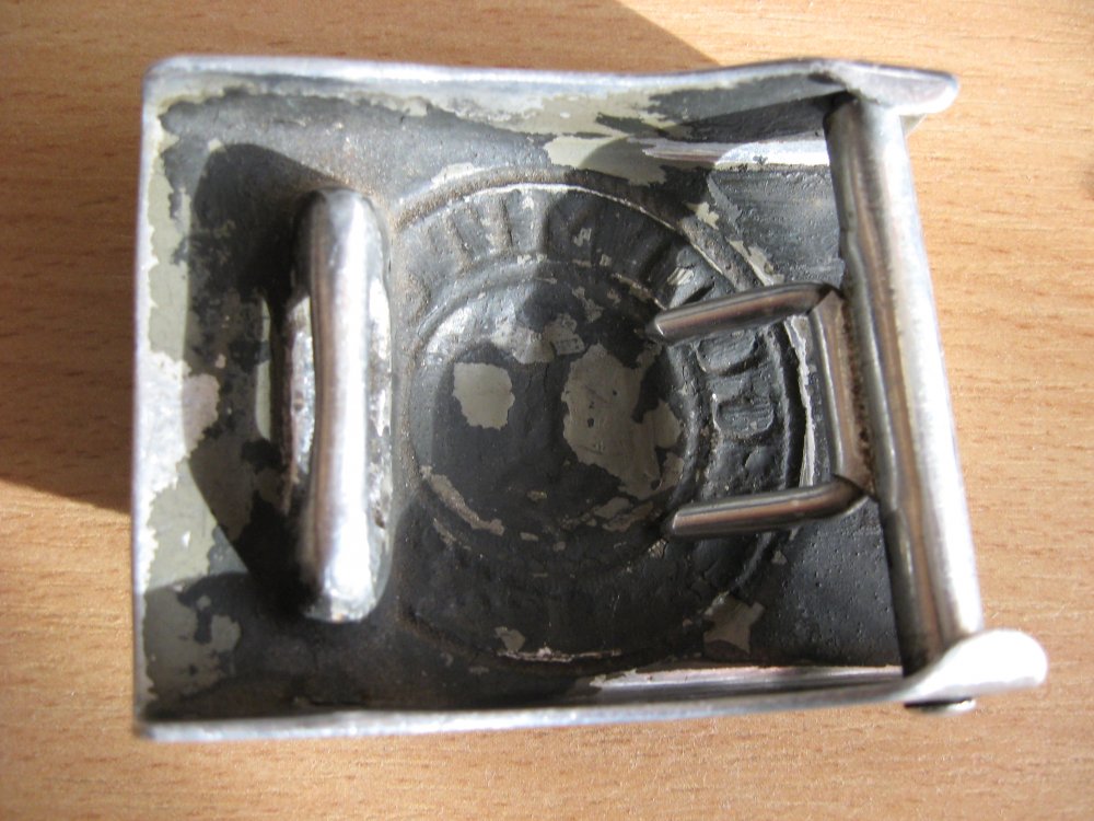 Попробовал смыть черную краску вокруг орла и с обратной стороны пряжки, под черной-остатки зеленой а на обратке проявилась надпись или маркировка.