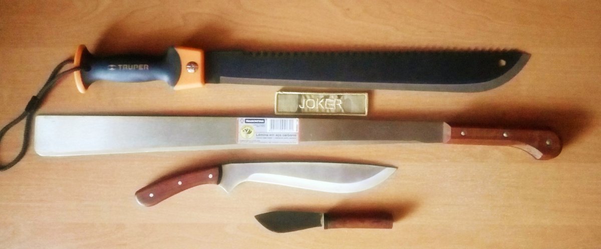 Было у меня трамонтиновское мачете, самое длинное во всей линейке-у которого рукоятка проволокой оплетена, кто интересовался-знает. Продал, неудобное именно из-за длины, затрудняет работу. Теперь вот такое.
