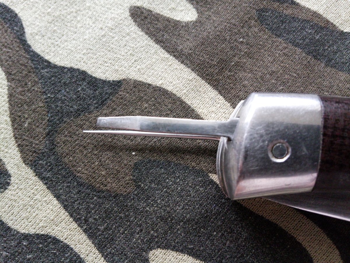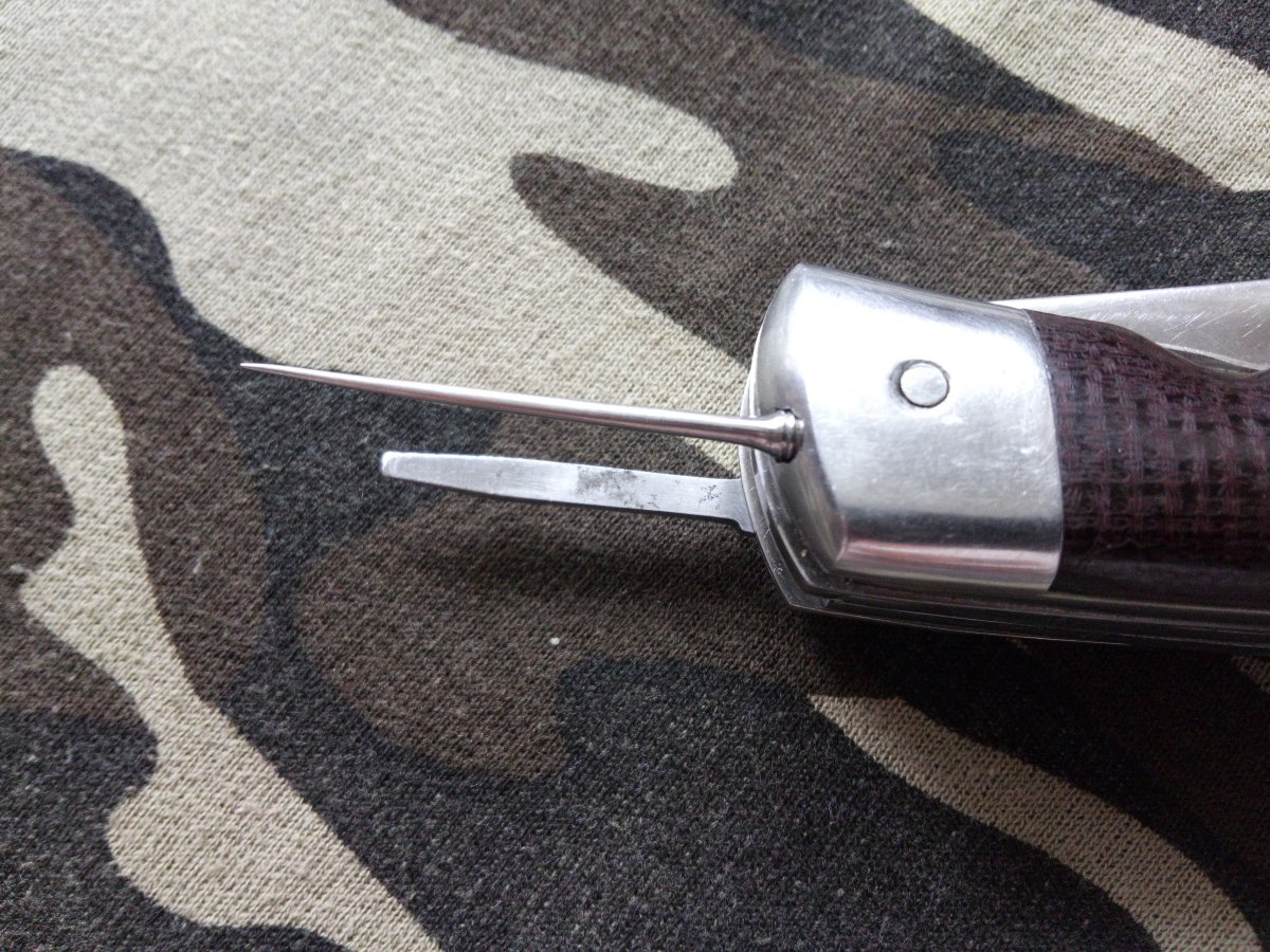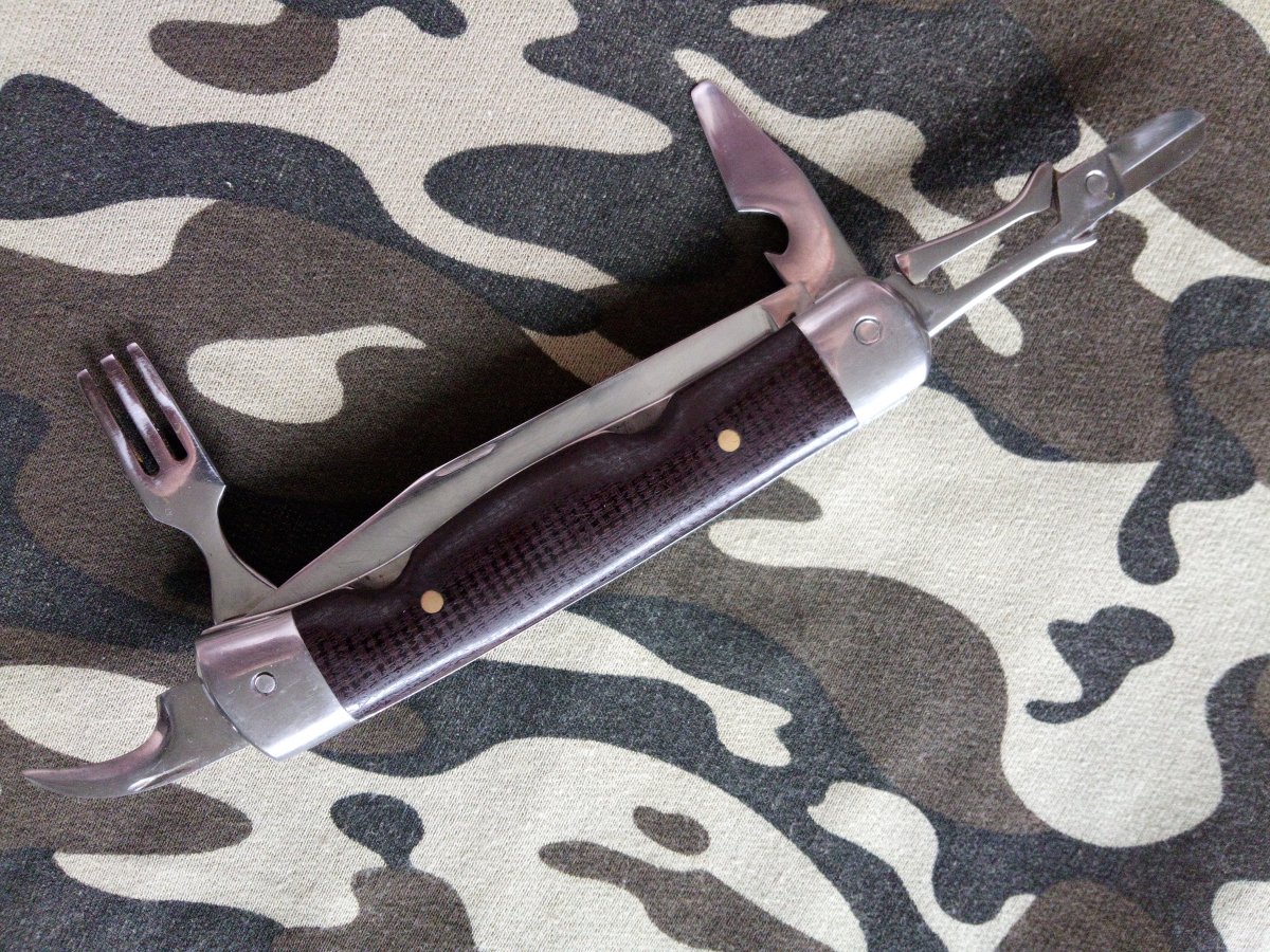 Може хтось бачив подібний ніж? Мені дістався років 20 тому ,вже б.у. Добряче над ним хтось познущався... Подібних не бачив ніколи. Ніж досить великий 24,5 см в довжину. Коротший від пентагону на кілька мм.Всі решта коротші.Лезо надщерблене (не мною), кажуть що ознака хорошого металу.Має оригінальні шило і малу викрутку.Шилом дуже зручно користуватись,досить тонке. Дуже потужні пружини,в середині мють ребра жорсткості. Вирізи під ніготь для інструментів теж таких не зустрічав. Надзвичайно зручний в користуванні.Маю кілька Вікторіноксів,близько не стоять,хоча вважаю іх дуже хорошими . Завжди беру тільки цей ніж з собою в походи.З ним навіть не страшно і в рукопашку. Окремо придбав футляр від якогось радянського ножа,сидить як влитий. Багато було прохань продати,але думки такоі ніколи не виникало. Прохання в індифікаціі.
