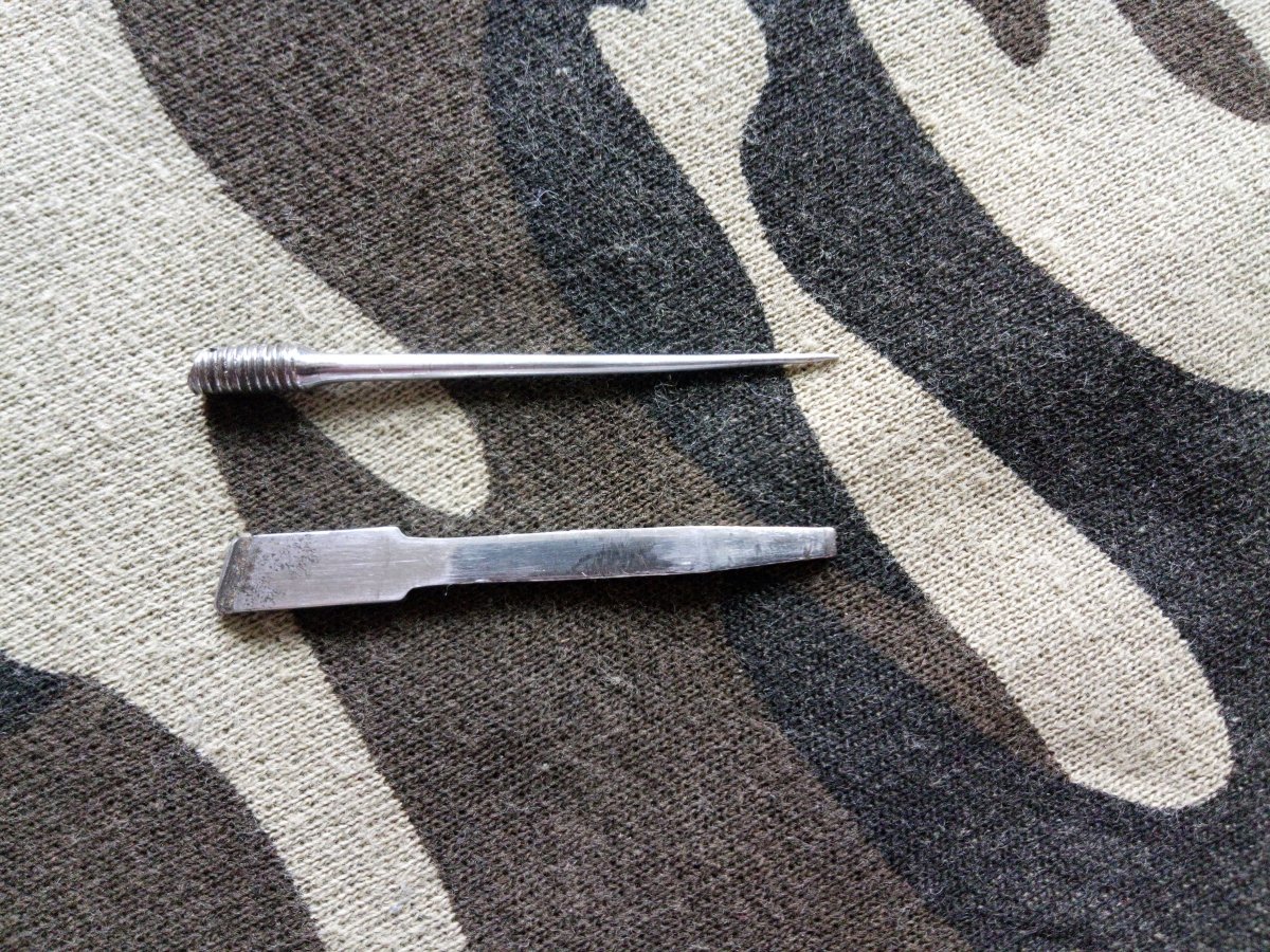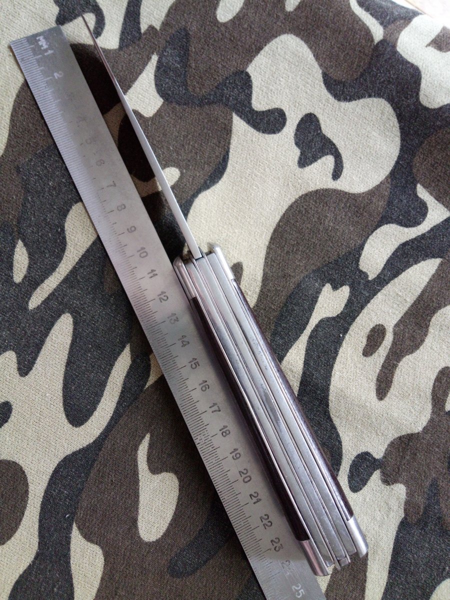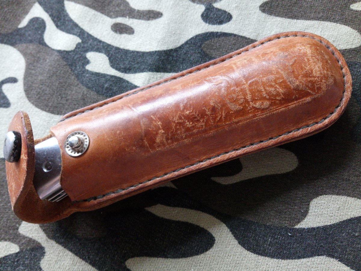 Може хтось бачив подібний ніж? Мені дістався років 20 тому ,вже б.у. Добряче над ним хтось познущався... Подібних не бачив ніколи. Ніж досить великий 24,5 см в довжину. Коротший від пентагону на кілька мм.Всі решта коротші.Лезо надщерблене (не мною), кажуть що ознака хорошого металу.Має оригінальні шило і малу викрутку.Шилом дуже зручно користуватись,досить тонке. Дуже потужні пружини,в середині мють ребра жорсткості. Вирізи під ніготь для інструментів теж таких не зустрічав. Надзвичайно зручний в користуванні.Маю кілька Вікторіноксів,близько не стоять,хоча вважаю іх дуже хорошими . Завжди беру тільки цей ніж з собою в походи.З ним навіть не страшно і в рукопашку. Окремо придбав футляр від якогось радянського ножа,сидить як влитий. Багато було прохань продати,але думки такоі ніколи не виникало. Прохання в індифікаціі.