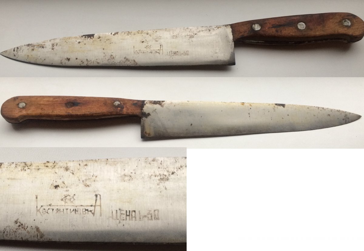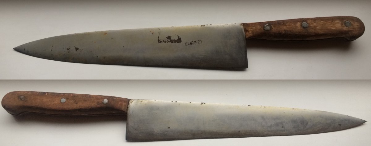 А такой вот артельный нож для разделки мяса, только немного меньше, у Вас случайно не завалялся? Ищу своему пару... На фото длина режика 48 см, ширина 17,5 см (пока еще не привел его в порядок): Желательно, митинской артели. Но, можно и любой другой, главное хорошее или отличное состояние ножа...