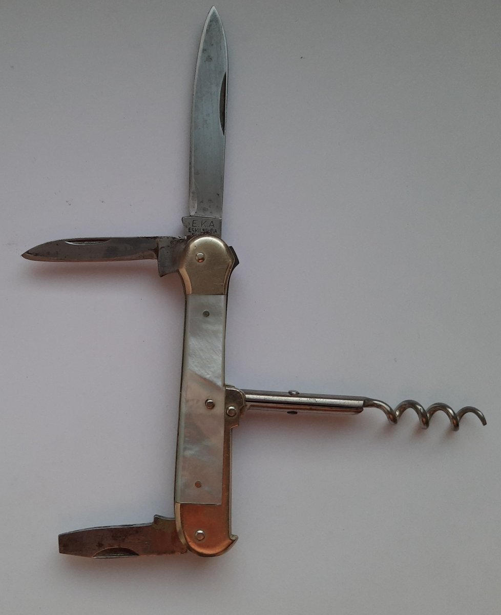 И качество изготовления старых ножей на очень высоком уровне, изделия делались на очень долгий срок службы, чтобы не подвести своего владельца в самый ответственный момент. Я купил старый нож Шведской фирмы Ека нож 1933 года, так качество изготовления просто зашкаливает, все работает как часы, подгонка на высочайшем уровне, на складном ноже пружины полированы в зеркало и с наружной стороны и с внутренней, нож очень комфортно открывается и закрывается, щелчки получше чем на Викториноксах и это на ноже которому 88 лет - сейчас к сожалению так не делают и с такой подгонкой не заморачиваются. На фото ниже - нож такой же как я купил. Фото своего ножа добавлю вечером как приеду с работы.