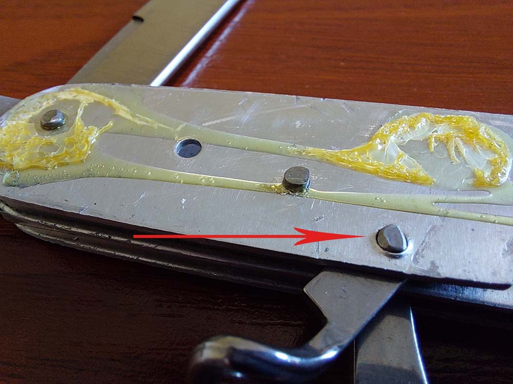 Трохи стикався з цими ножами. Вони зібрані на звичайних стальних заклепках, без грибочків для фіксації плашок, а плашки просто приклеєні. Зрізав заклепки і ставив на латунні з грибками. Грибки брав зі старих ГАКів. Плашки нащолкнулись як рідні, люфти пропали. З часом правда люфти трохи з'явилися, але не критичного.