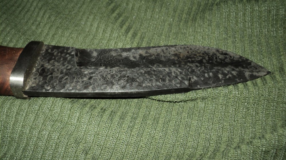 Дамасковый,клинок из Индии,с закалки,нужно полировать и заново травить.Рукоятка-мадрон,навершие и гарда-титан.Рисунок дамаска назван кузнецом \капли дождя\ .Собран предварительно.