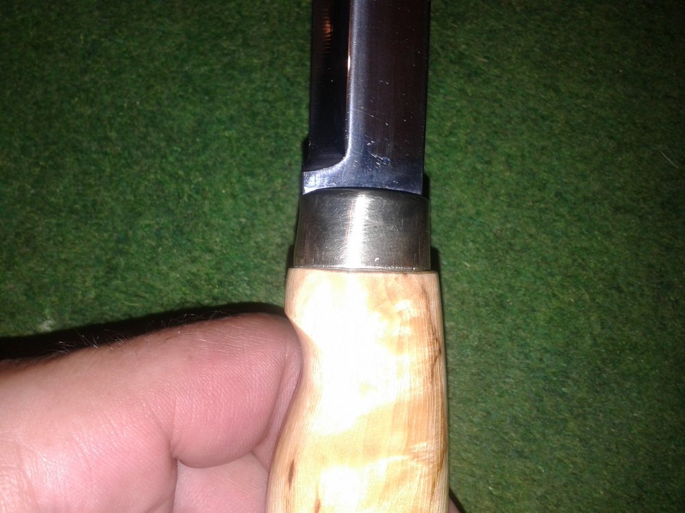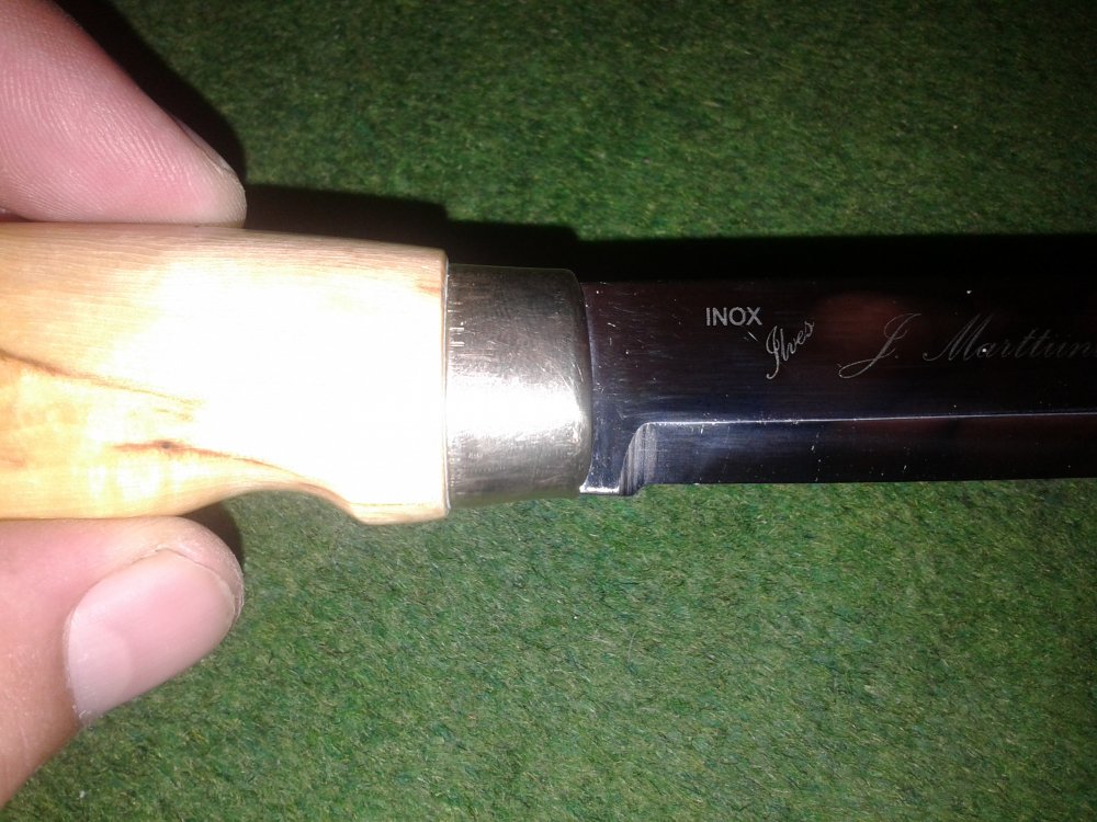 Приветствую, как и обещал фото оковки рукояти, зазора между клином и оковкой рукояти финки Мартини рысь, извиняюсь за фото на улице пасмурно, освещение никакое. Нож используется на природе, режет мясо на шашлык, ветки, работает на кухне ну в общем все то, что должен делать нож (гвозди, рельсы, стекло и тд. конечно им не режу), в общем отличный нож, заточку держит отлично несмотря на то, что нержавейка, Мору из нержавейки правлю чаще. С ув.