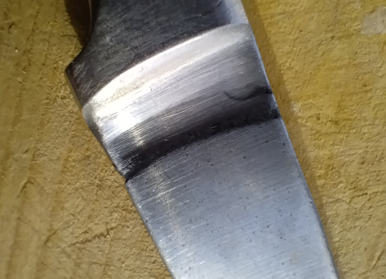 Так от і я про це - якби було зварювання, було б видно хоча б якийсь шов, або ледь помітні сліди цього шву. І самого початку, після покупки, протягом якнайменше років 8 , взагалі все було добре, ніж собі та і ніж. Але потім стали з'являтися дуже дрібні чорні цятки, які мали дивну локацію - групувалися по дузі. На фото видно вже кінцеві наслідки, коли ці цятки злилися вже в сплошну чорну дугу і стали з'являтися дрібні виразки на цій чорній масі. Не можна зрозуміти, з чого складається ця чорнота, це ж точно не може бути вільний вуглець В мене була тільки одна версія - якійсь скритий дефект злитка чи прокату, який з часом під впливом вологи, солі та інш. проявився вже у готовому виробі. Але чи можливе таке? І що то за чорна субстанція, яка зайняла так багато місця? Здається, ще кілька років, і лезо само відпаде.