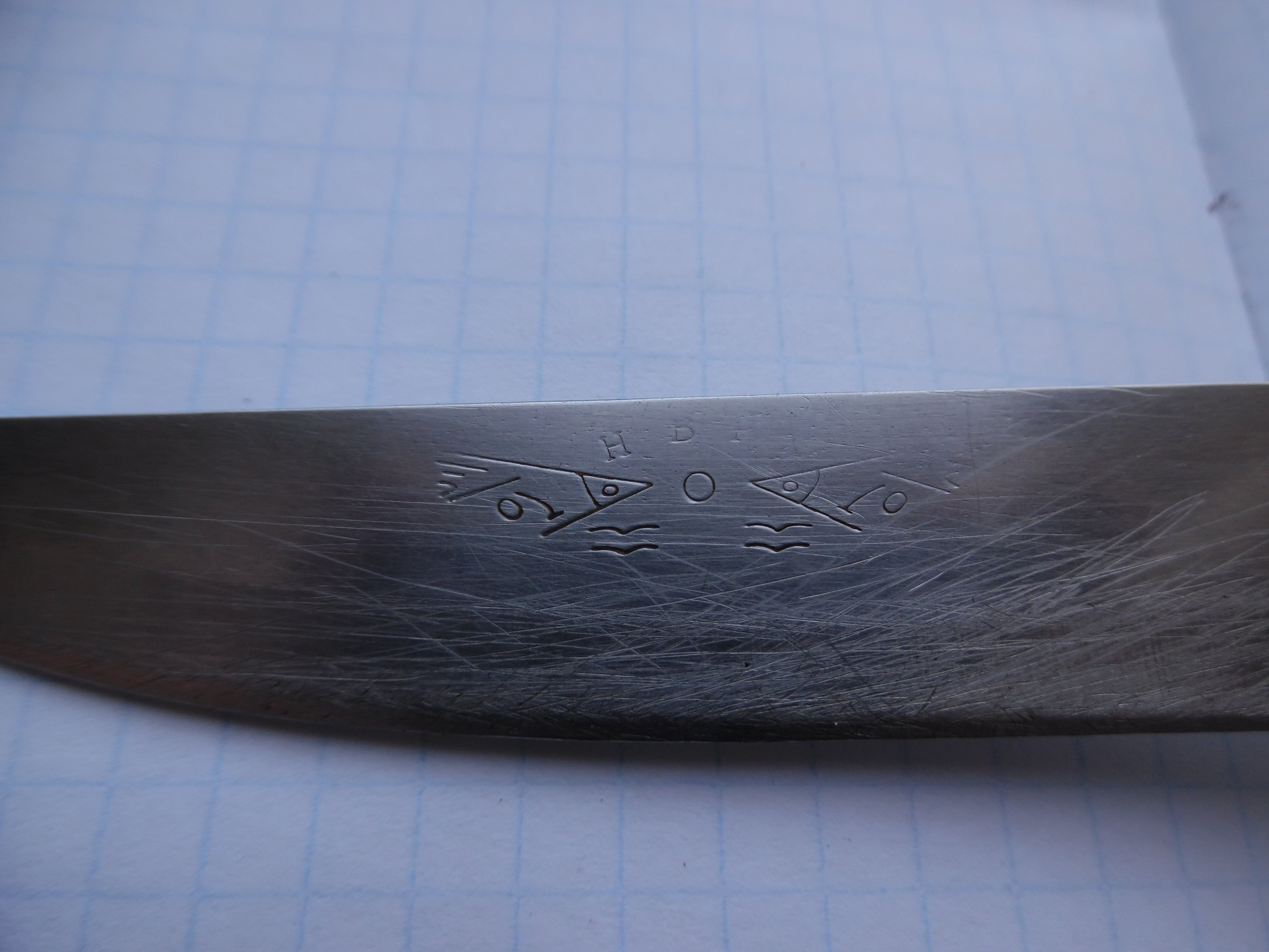 Добрий вечір. Скільки копаю іноді попадались ножики по війні з лезом з нержавійки. Але щоб повністю з нержавійки - це вперше. Присутнє клеймо у формі рибки та проступають літери HB... Сопутка була друга світова. Може хтось підкаже по клейму: виробник, країна?