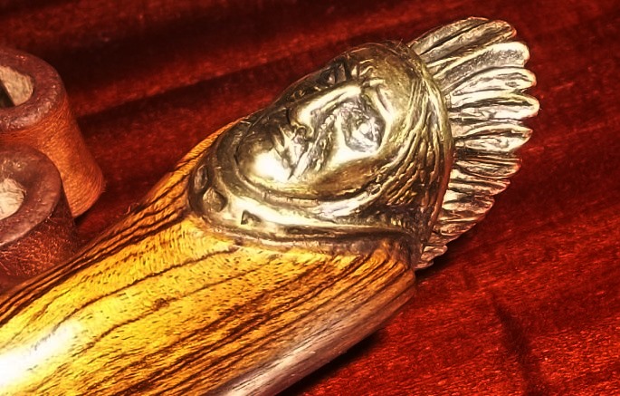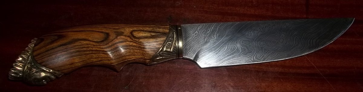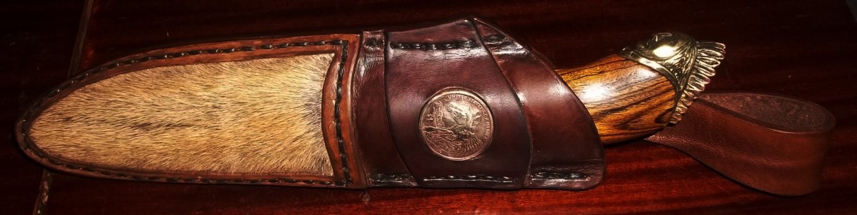 Новый ножиГ ))) Подарок брата, его работа. Ножны- кожа,камус, в виде украшения- т.наз. "доллар Сакаджавеи". Сам нож-клинок от ножевого центра "Булат", рукоять- бокоте, латунное литье.