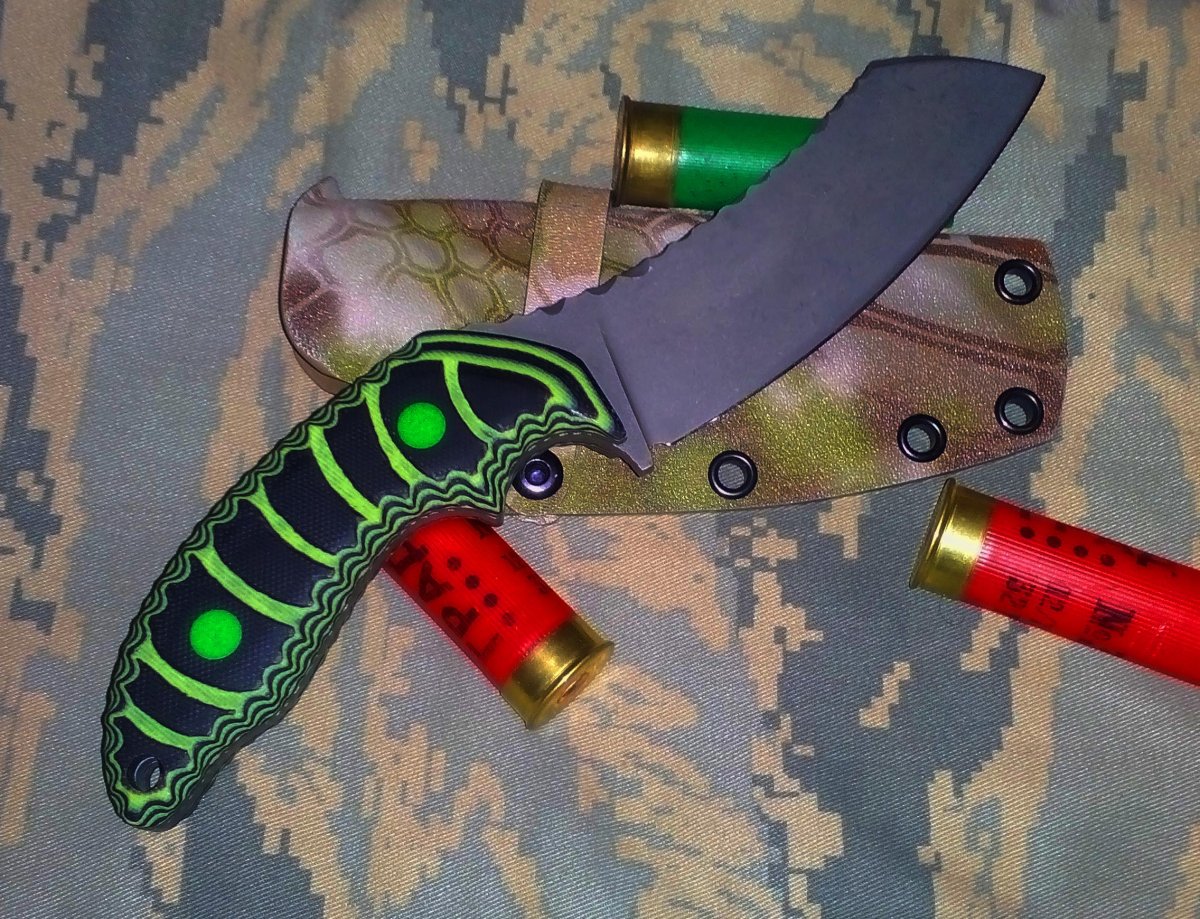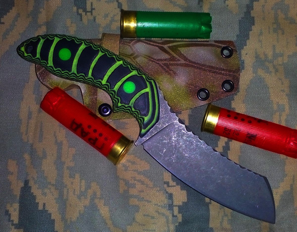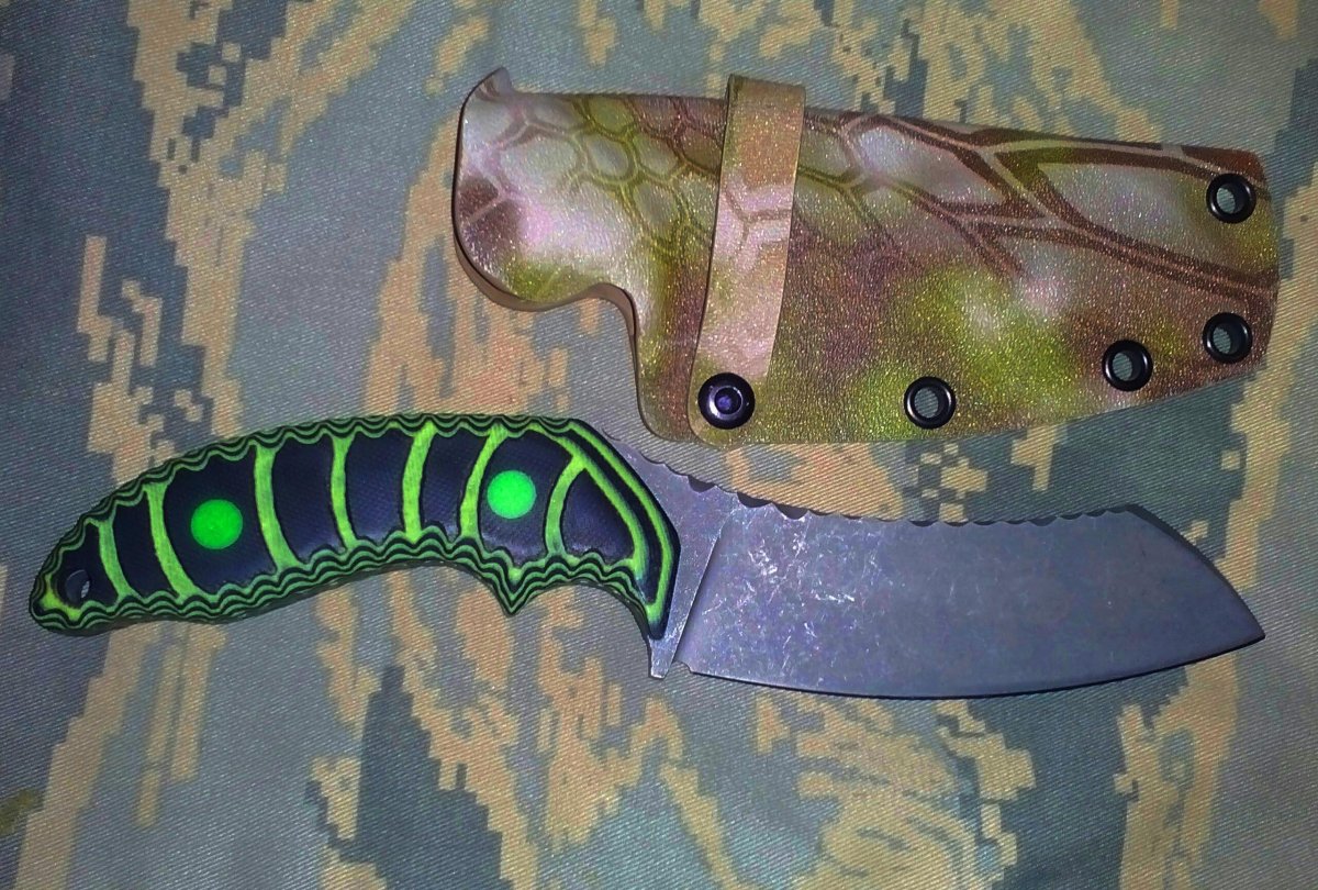 Нож по мотивам кобл блейдовского Шершня,. цены на их ножи я не потяну,а нож очень понравился,покрутил в руках на Стальной грани. Сталь n690 58-59 ед то Инструментальщик Накладки G10,верх был изначально зеленый ,переделал сам,немного криворуко)))инструмента нет. По обуху битый камень и битый лед по рукояти.Для охоты самое то,несмотря на кухонный вид в мясо входит по самую рукоять)))Стяжки залиты эпоксидкой с люминофором...