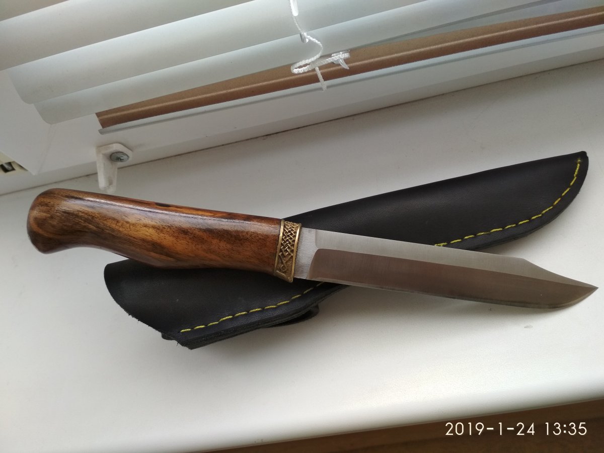 Цена не тайна ,сделал сам.Сталь начинает ржаветь только после двух суток в мокрых ножнах,без просушки.Проверено.